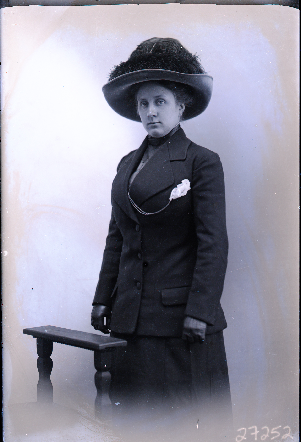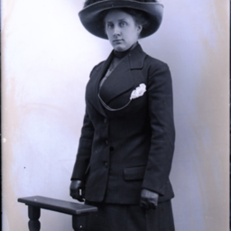 Unidentified woman in a hat decorated with feathers, is standing by a chair and wearing gloves, jacket and skirt.