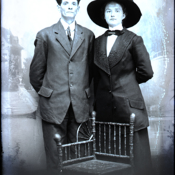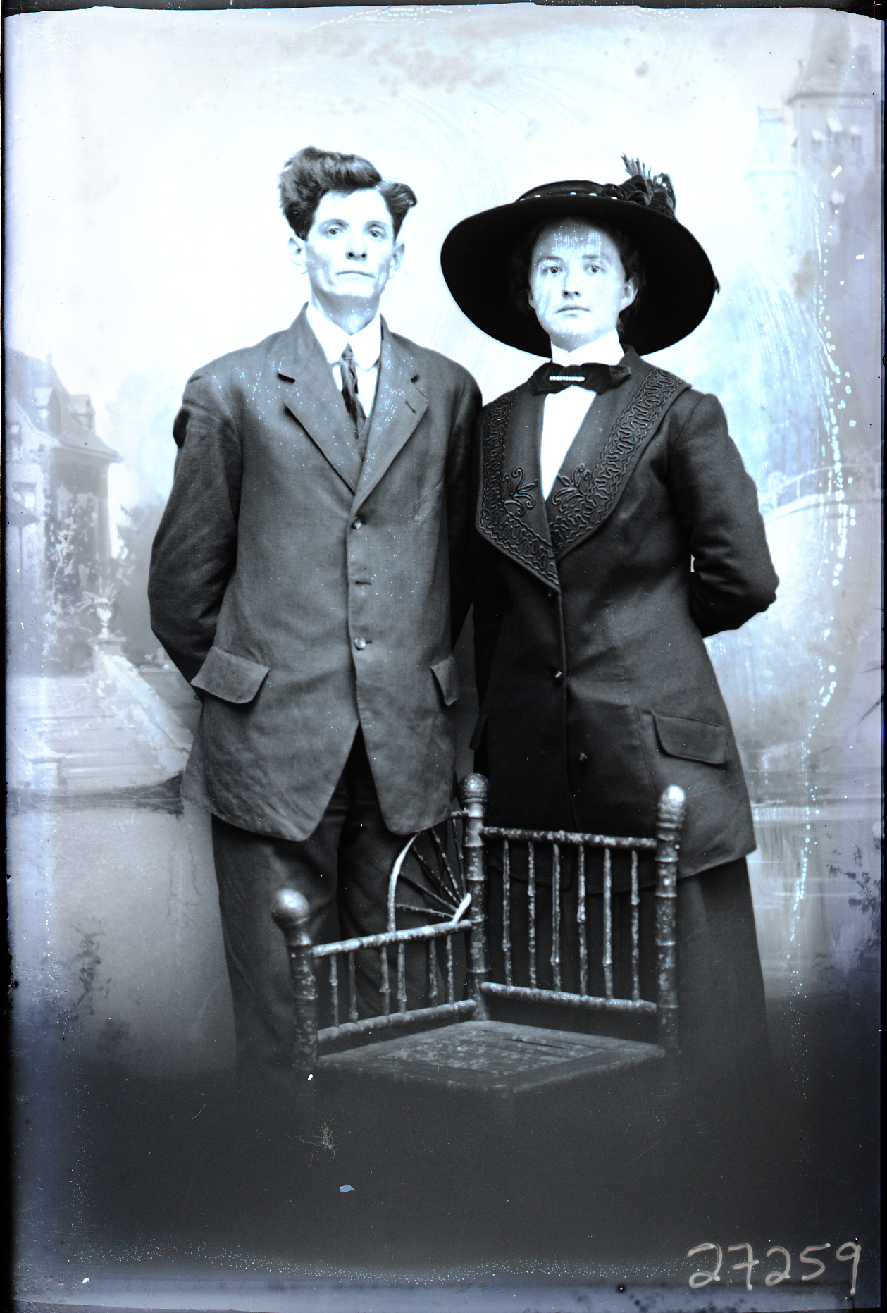 Unidentified man in a suit and tie is posed beside an unidentified woman in a wide-brimmed hat.