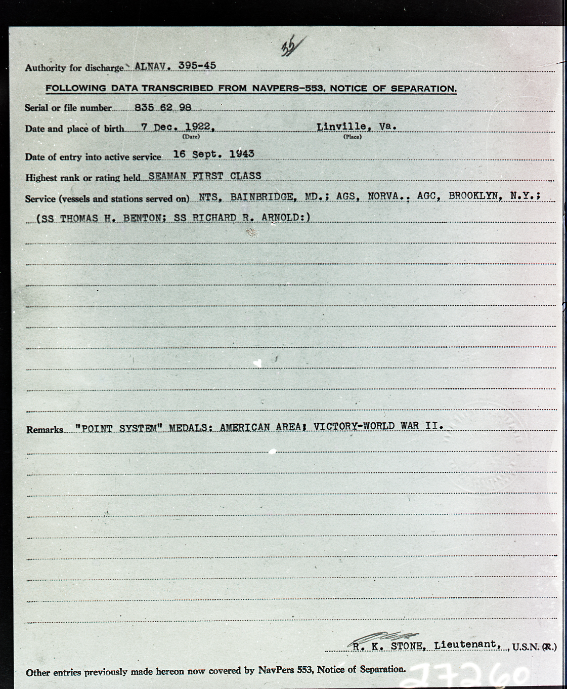 Morrison Studio, “Page From a Naval Separation Packet,” Shenandoah County Library Archives, accessed December 5, 2025, https://archives.countylib.org/items/show/56938.