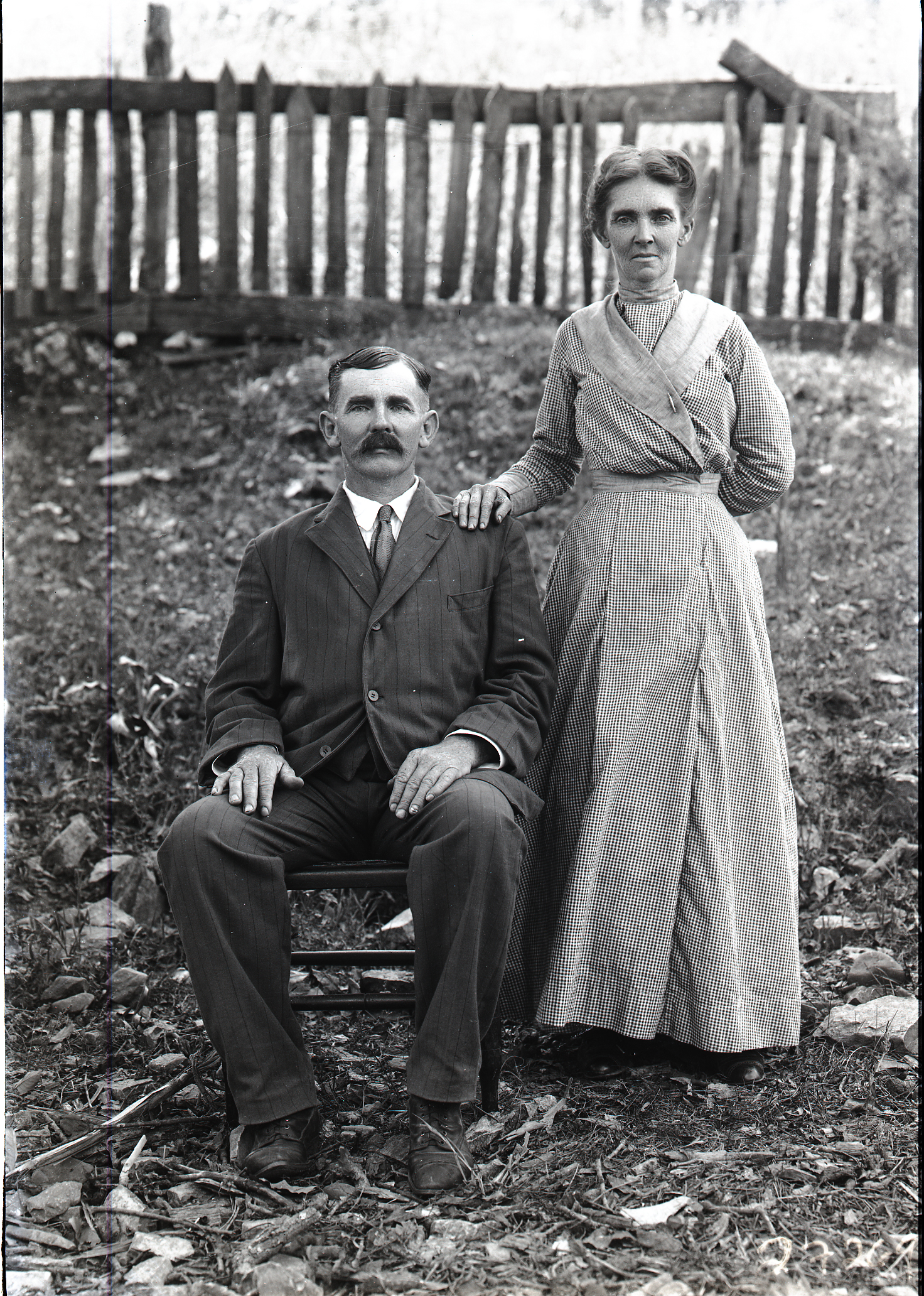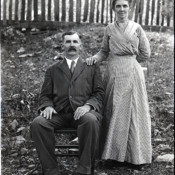 Unidentified man with a mustache, seated, is posed beside an unidentified woman who is standing beside him with her hand resting on his shoulder.
