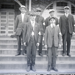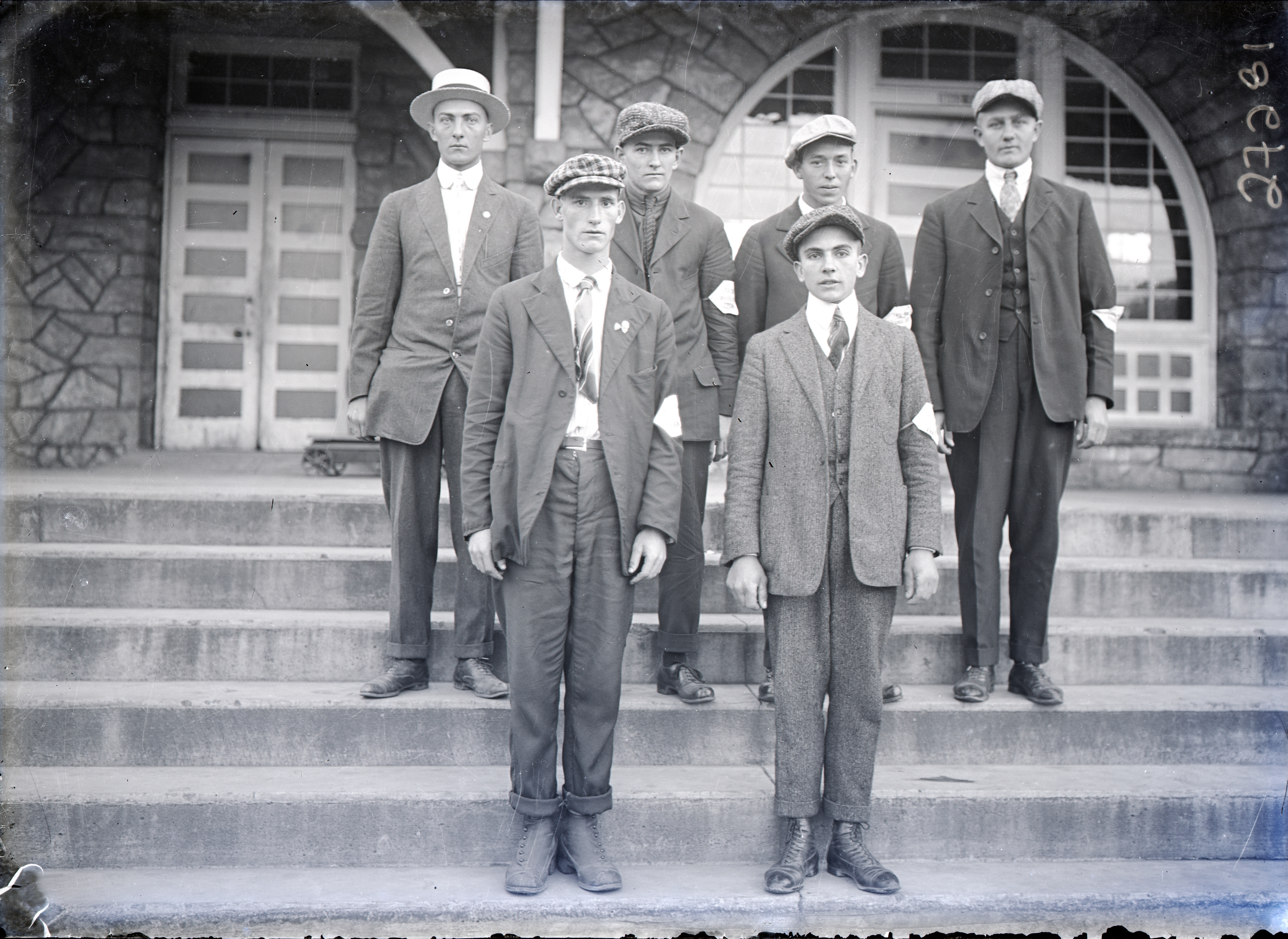 Photograph of six unidentified Shenandoah County men leaving for World War One Army Service, as indicated by the white armbands all are wearing.