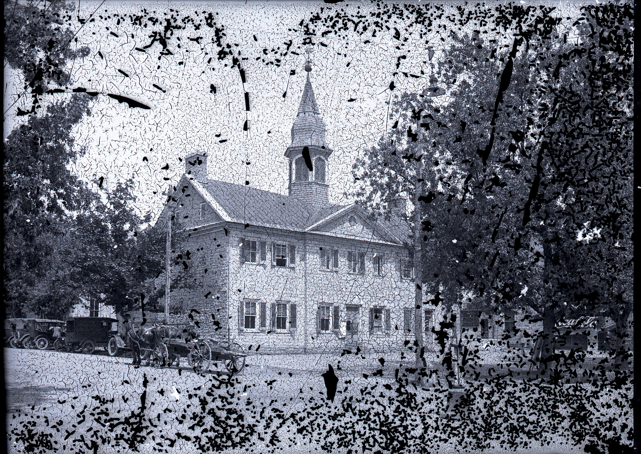 Damaged image of the old Shenandoah County Courthouse located on the northwest corner of Court and Main Streets in Woodstock, and taken from across the street diagonally.