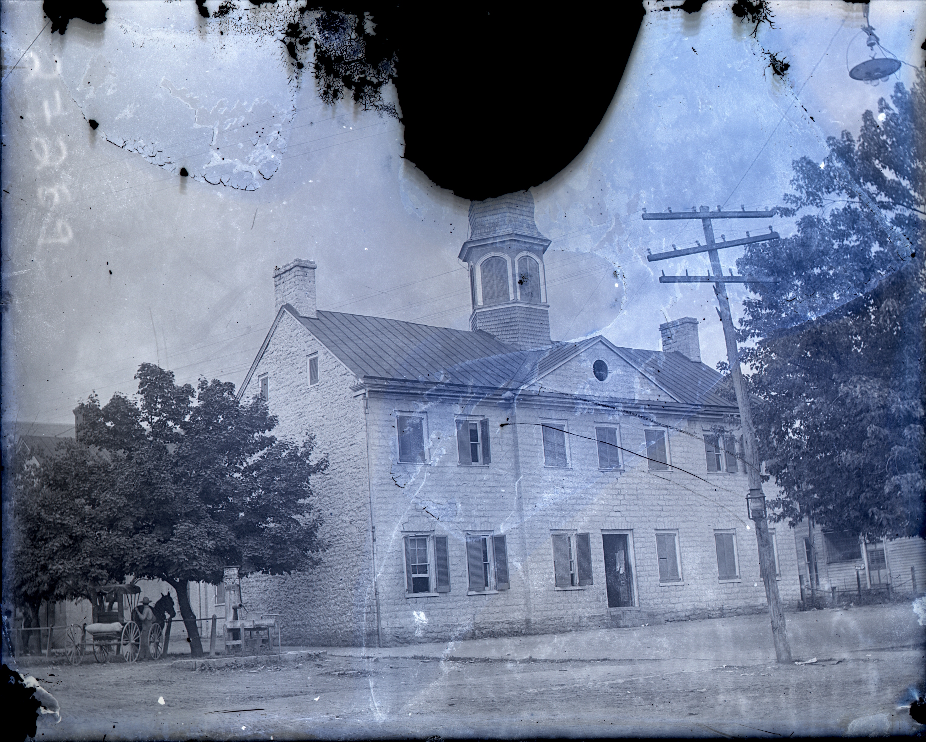 Damaged image of the old Shenandoah County Courthouse located on the northwest corner of Court and Main Streets in Woodstock, and taken from across the street diagonally.