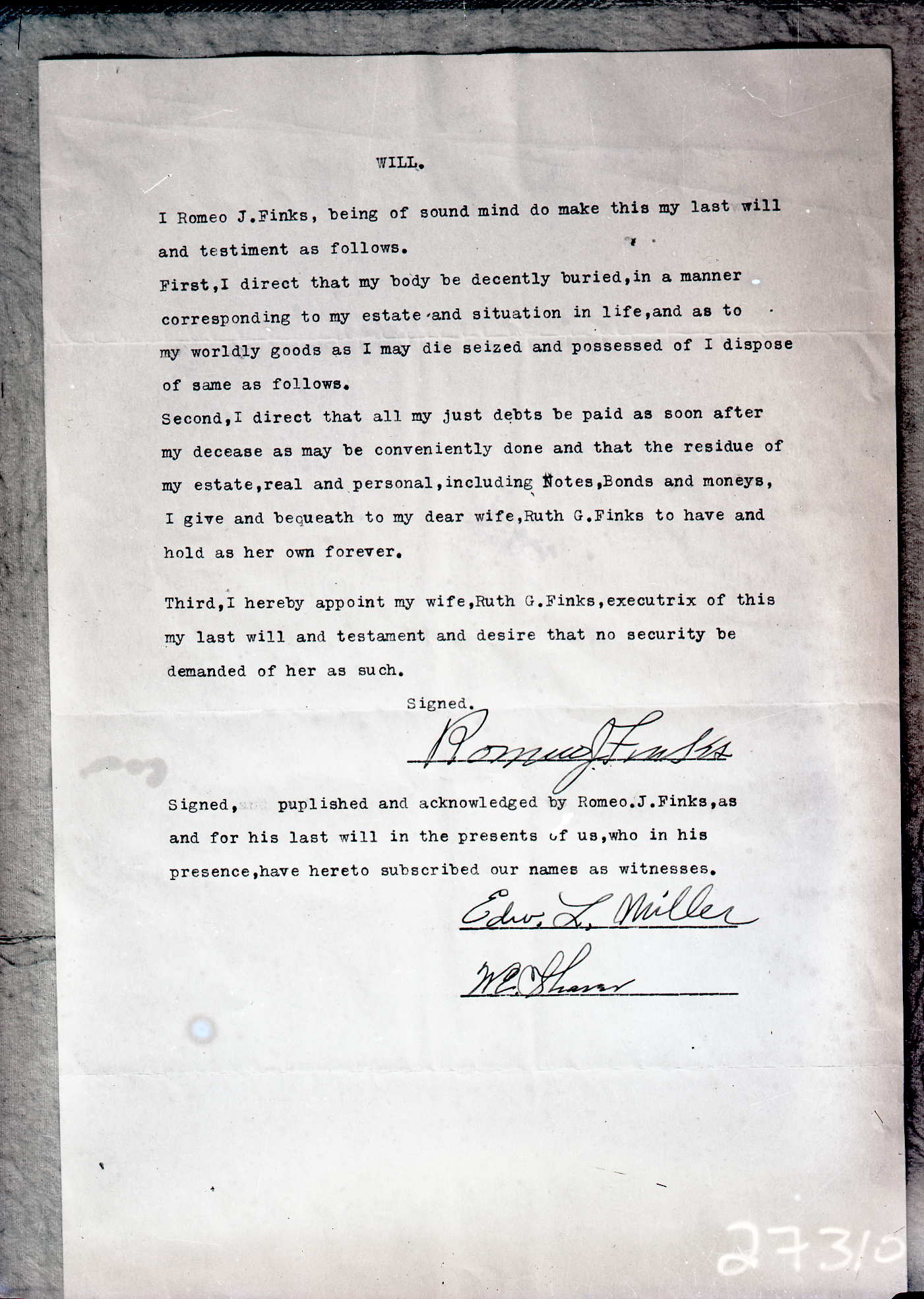 Morrison Studio, “Will of Romeo J. Finks,” Shenandoah County Library Archives, accessed December 5, 2025, https://archives.countylib.org/items/show/56988.