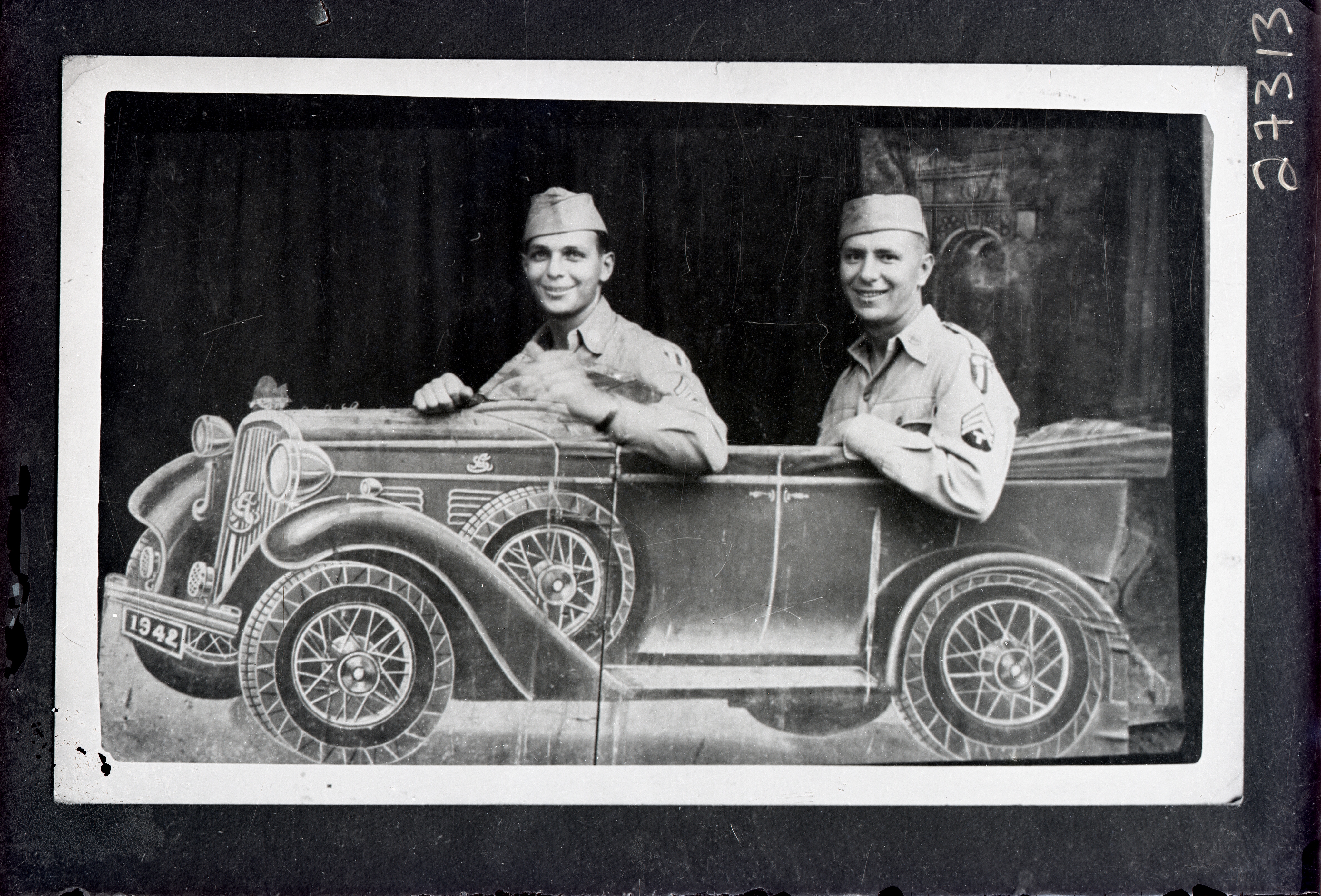 Photo of a photograph of two unidentified men in U.S. Army uniforms and posed in a faux automobile.