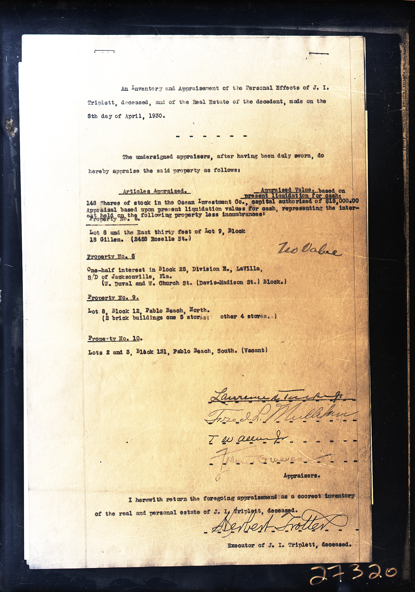 Photograph of a typewritten page that lists the inventory of personal effects and real estate of J.I. Triplett, deceased.