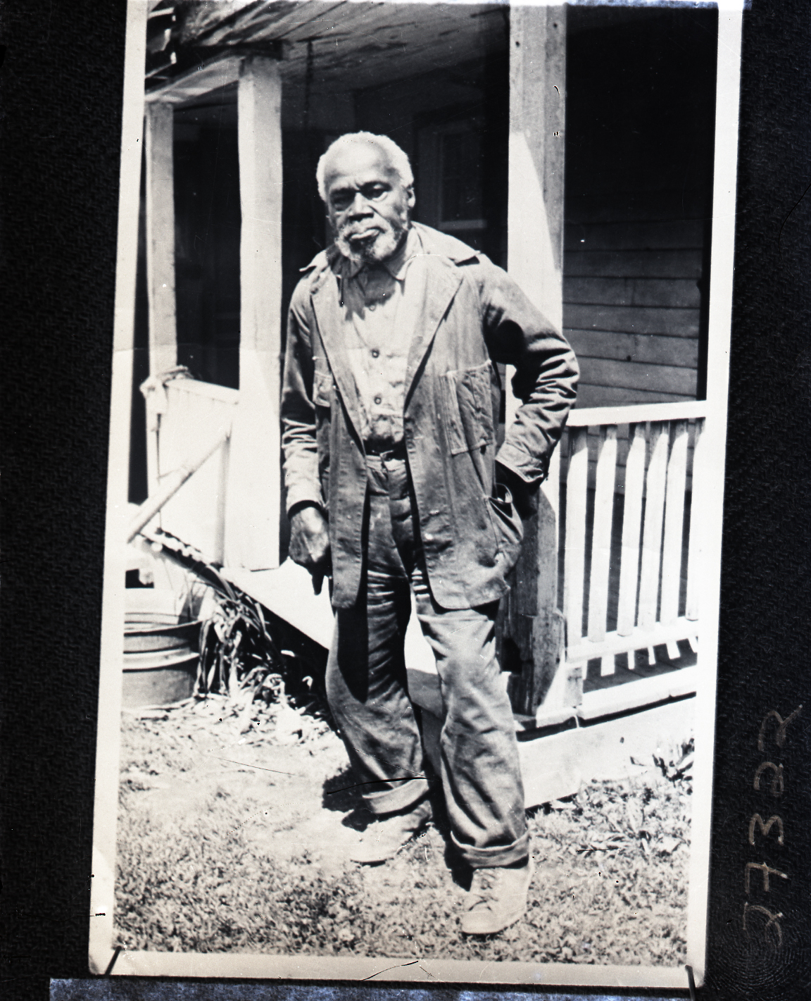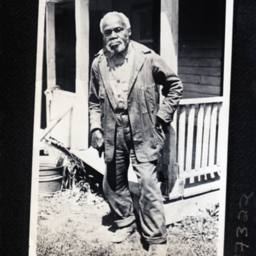 Photo of a photograph of an unidentified African American man with a beard and mustache. He is wearing work clothes and standing outdoors in front of a small porch.