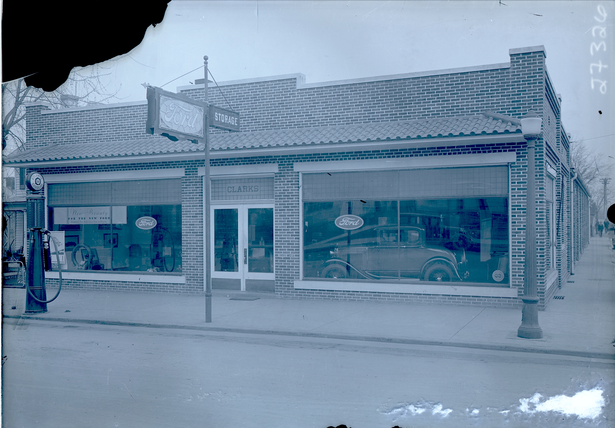 Photograph of the front of the Sam Clark Ford Dealership that was located at the corner of E. High Street and S. Main Street, Woodstock Virginia. It was also a gas station.