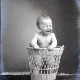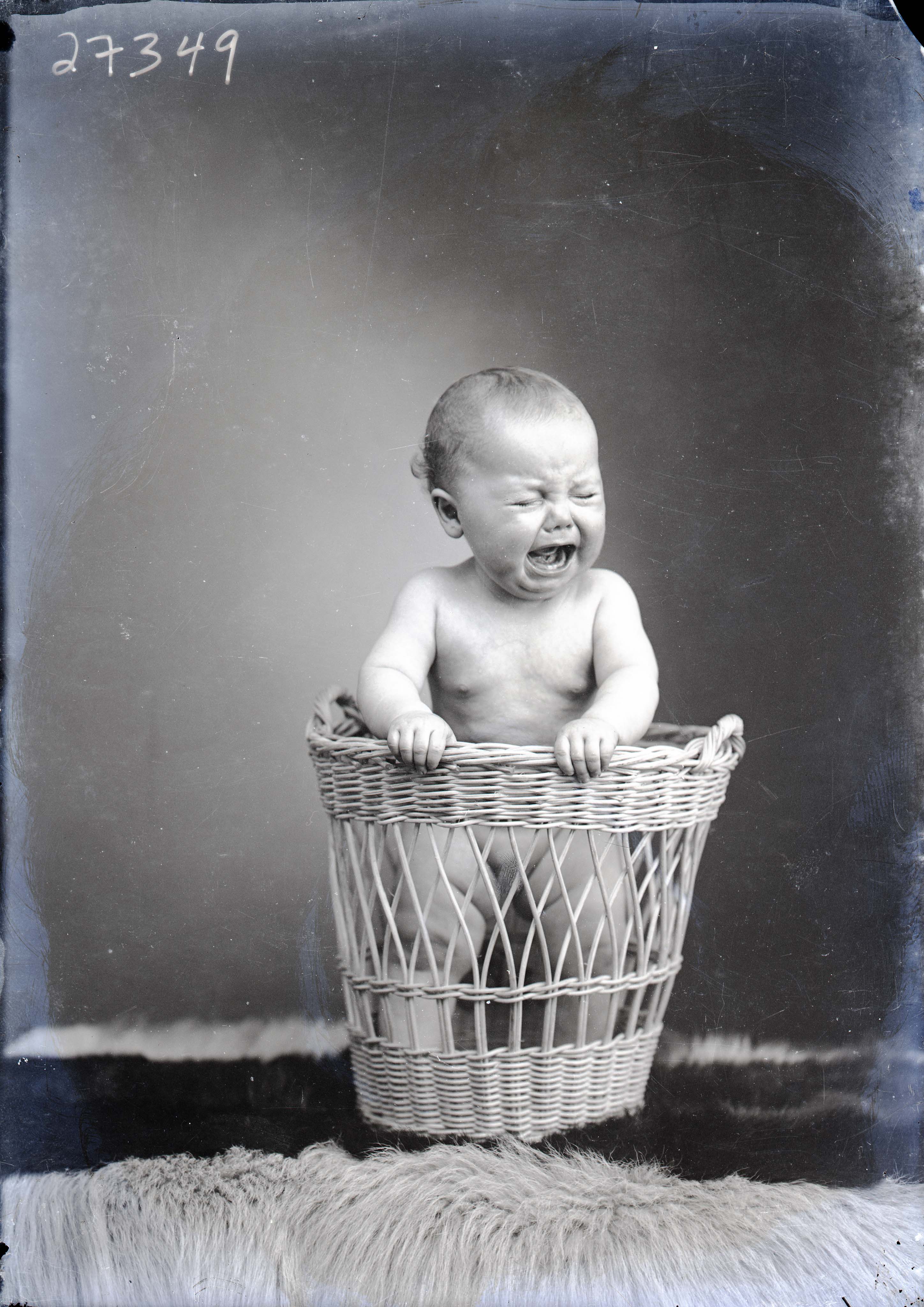 Unidentified naked toddler is standing in a wicker basket and crying.