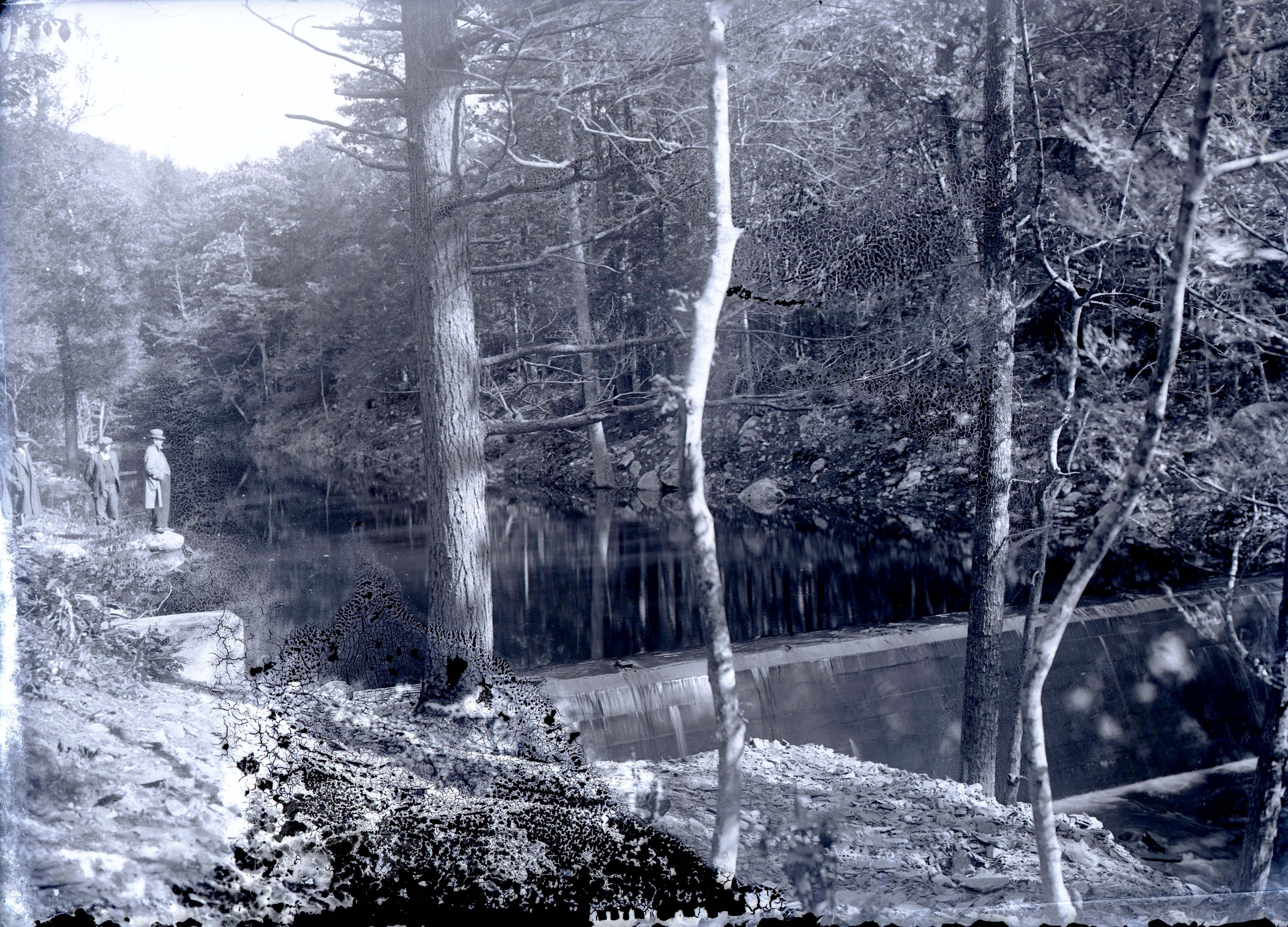 Three unidentified men, in coats and hats, are looking at the Woodstock Reservoir. A small concrete dam contains the water on one side.