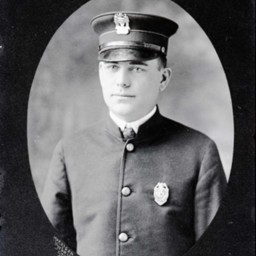 Photo of an oval-framed photograph of an unidentified man wearing a uniform and cap. There is a badge pinned to his chest.