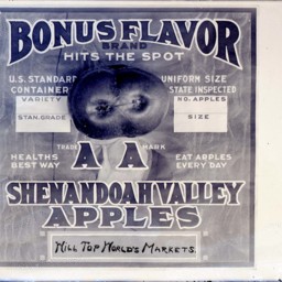 Photograph of a poster that advertises Shenandoah Valley Apples and their "Bonus Flavor Brand" that "hits the spot". The ad promise that the apples will "top world's markets".