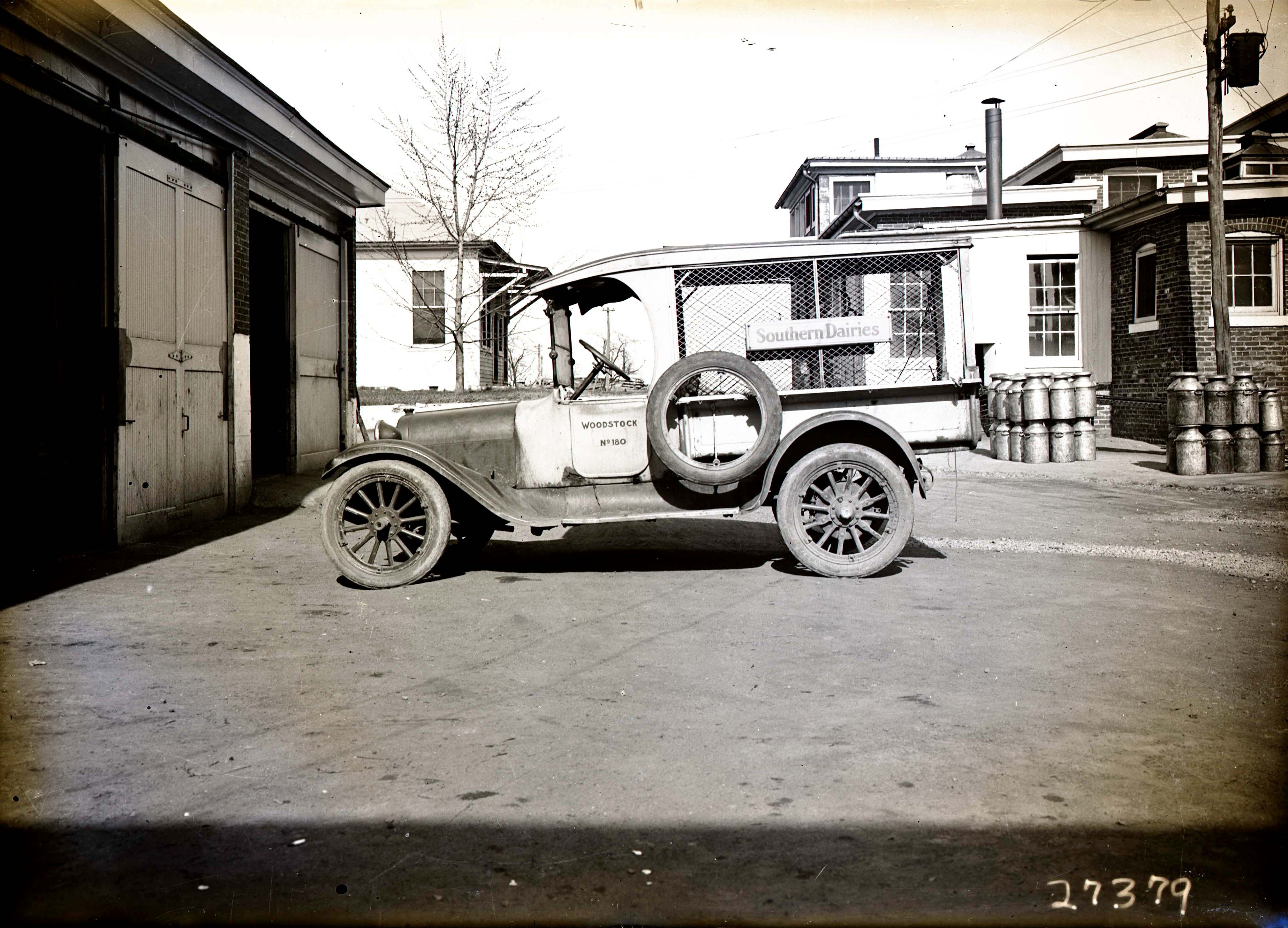 Photograph of a Southern Dairy Truck parked in front of the dairy in Woodstock.