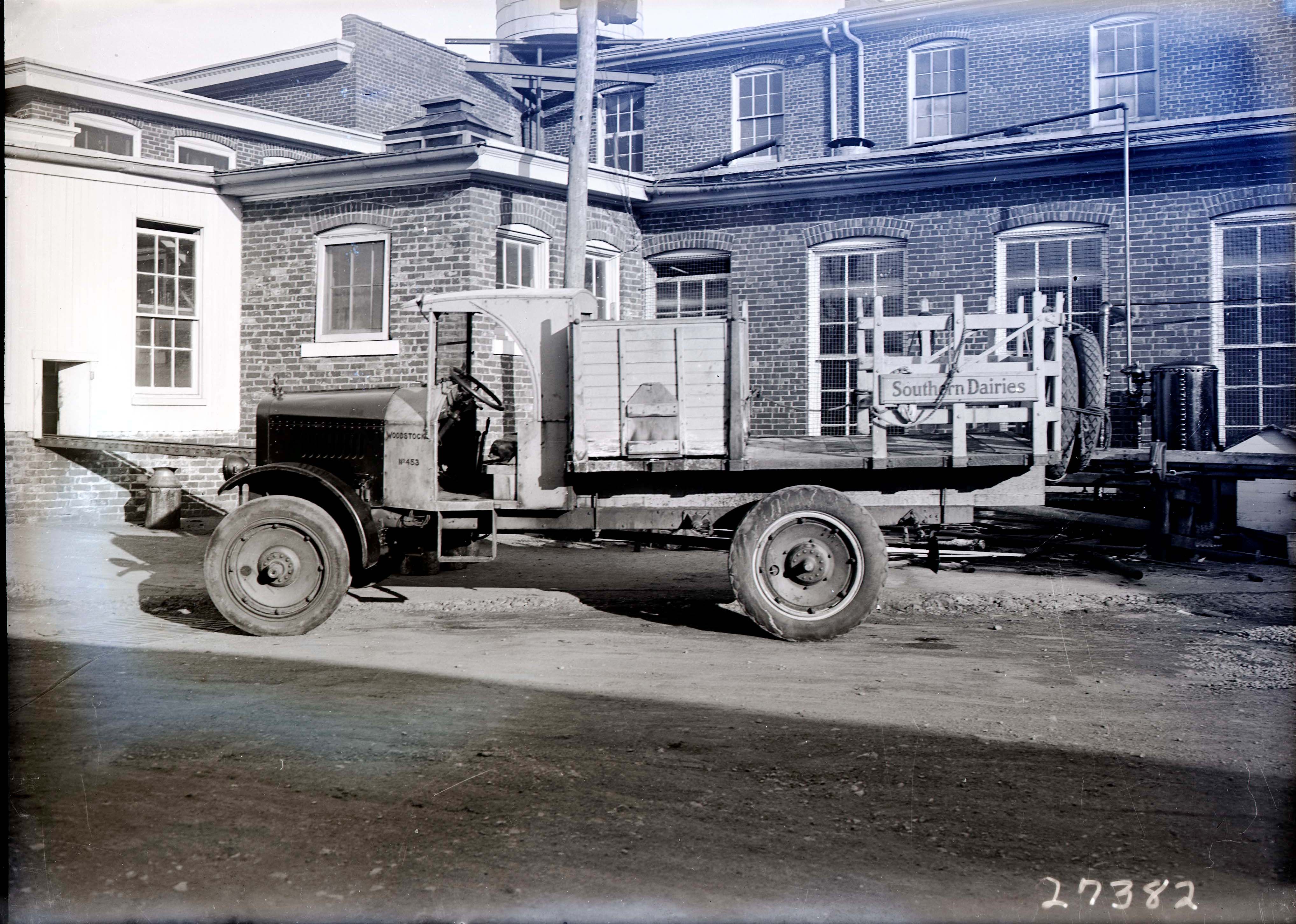 Photograph of a Southern Dairy Truck parked in front of the dairy in Woodstock.