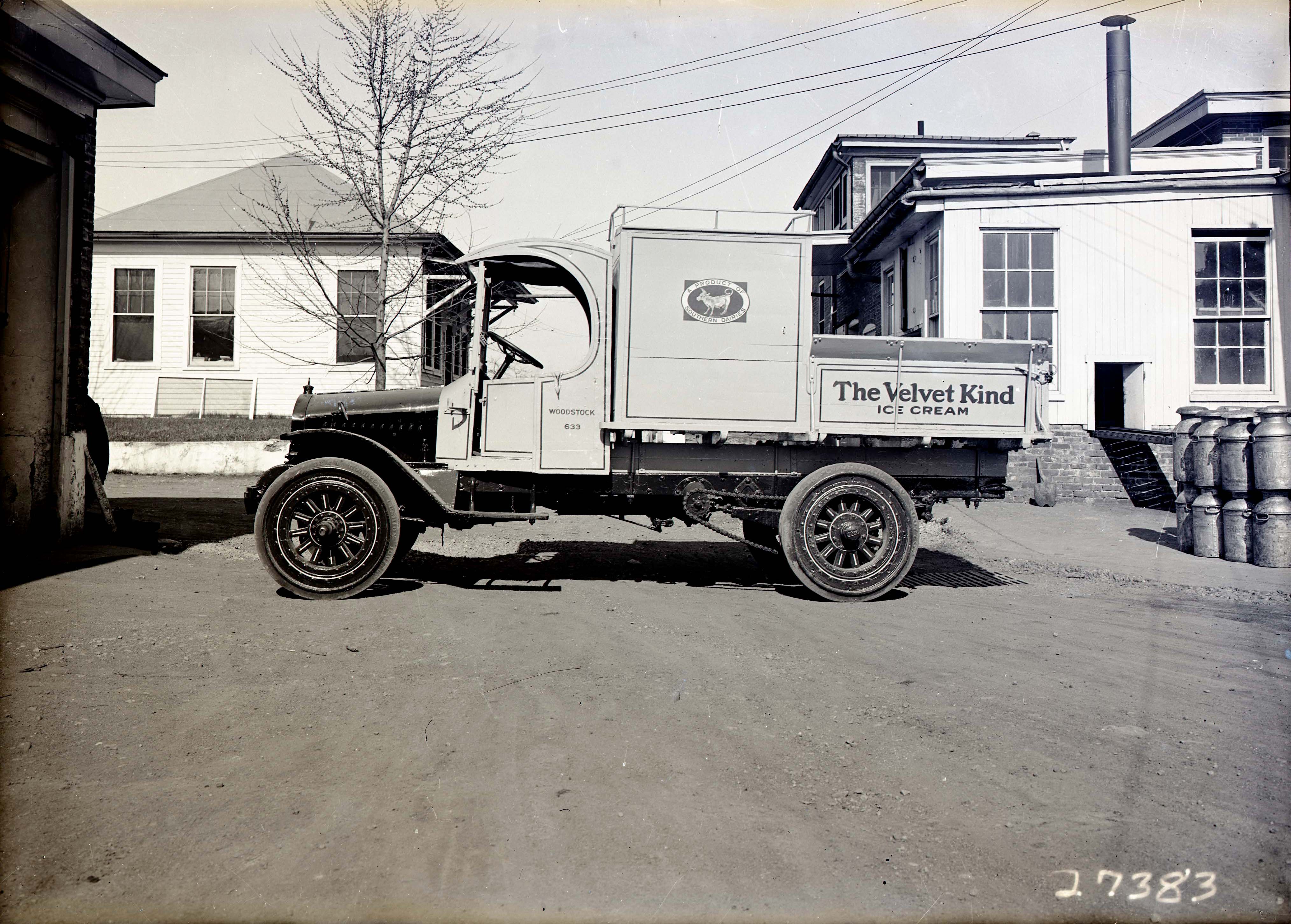 Photograph of a Southern Dairy Truck parked in front of the dairy in Woodstock.
