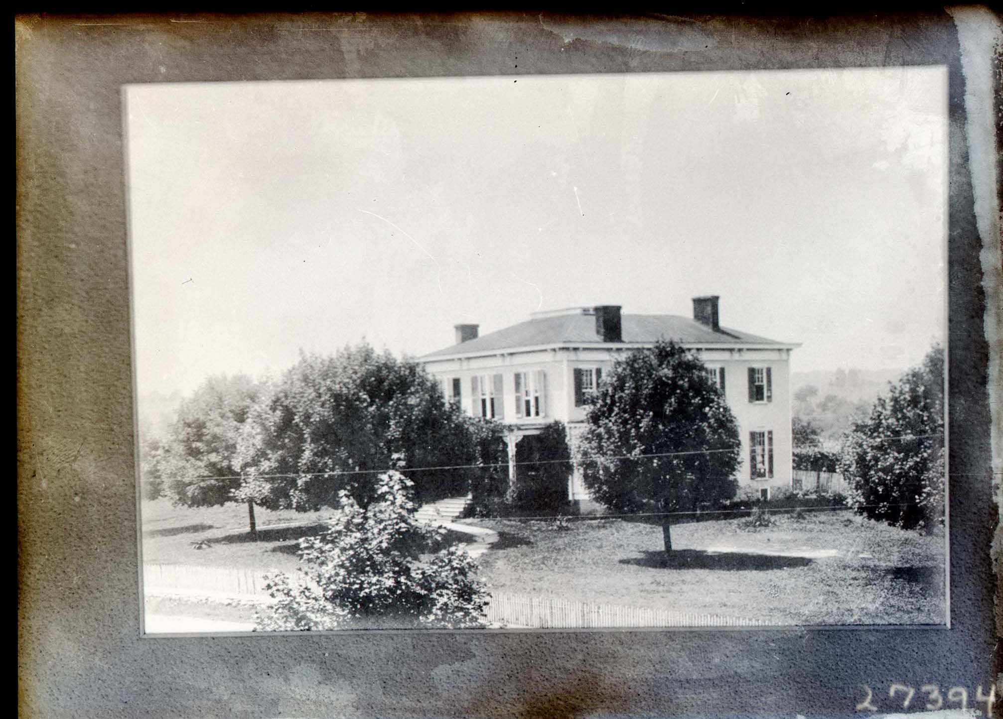 Photo of photograph of an unidentified large two-story home with three visible chimneys and several large trees around it.