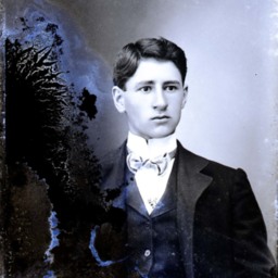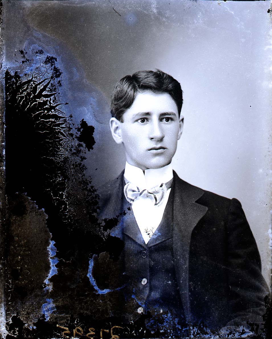 Portrait photograph of an unidentified young man wearing a suit and bow tie with a high, starched collar.