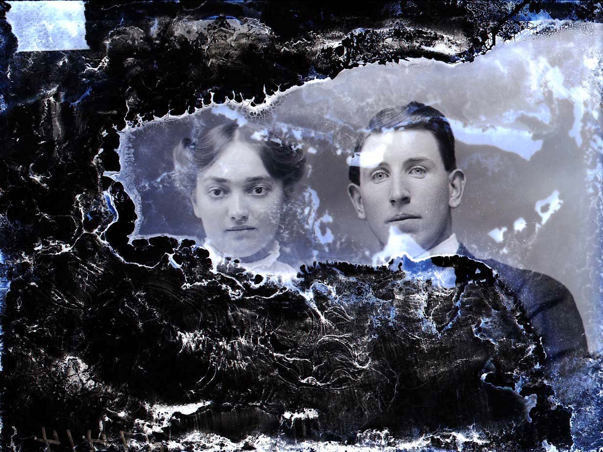 Significant emulsion damage is visible and obscures all but their faces.