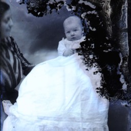 Unidentified baby in a long white gown is being supported by a woman on the left.