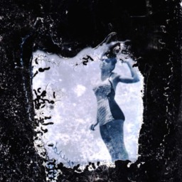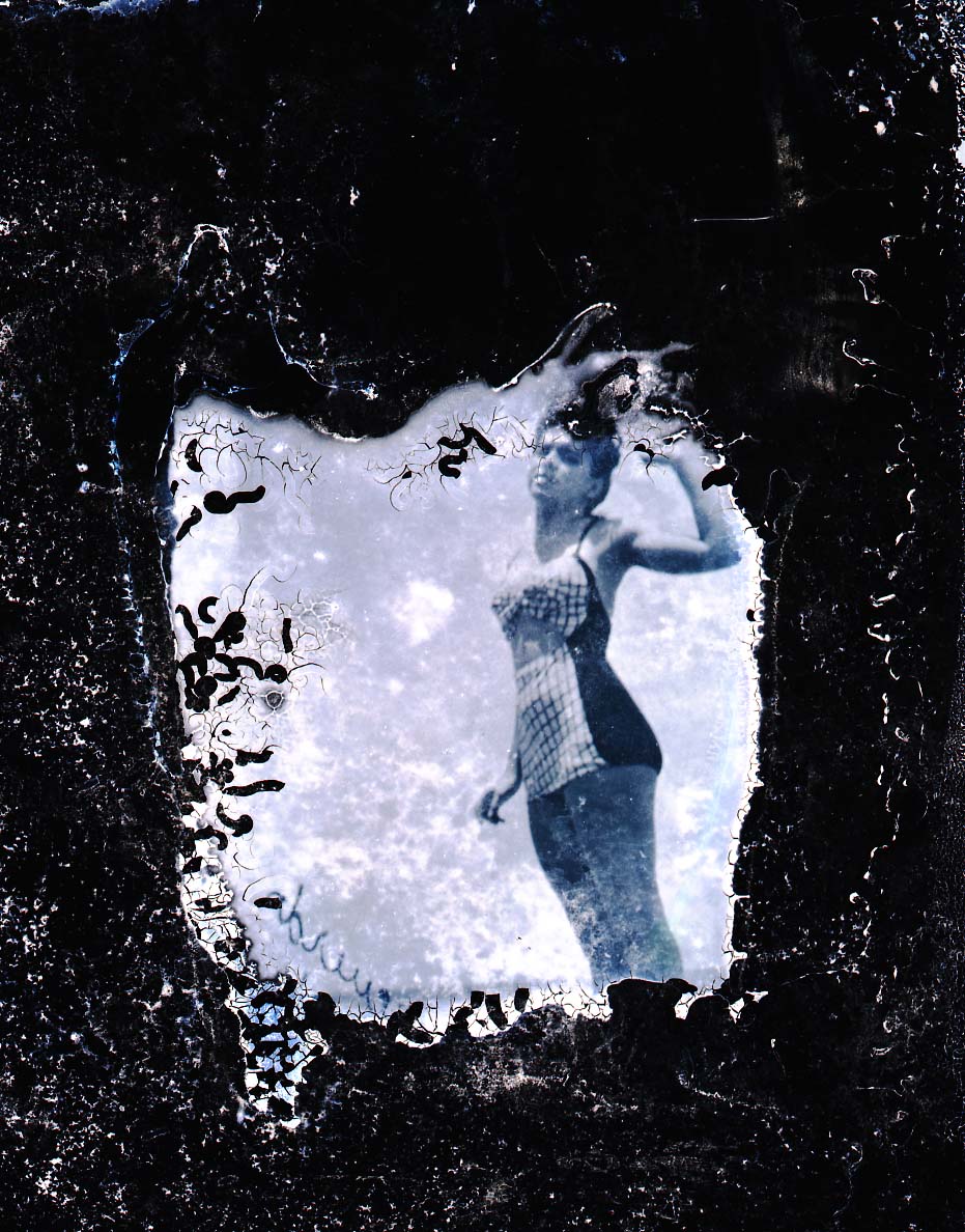 Damaged image of an. unidentified woman wearing a bathing suit outdoors.