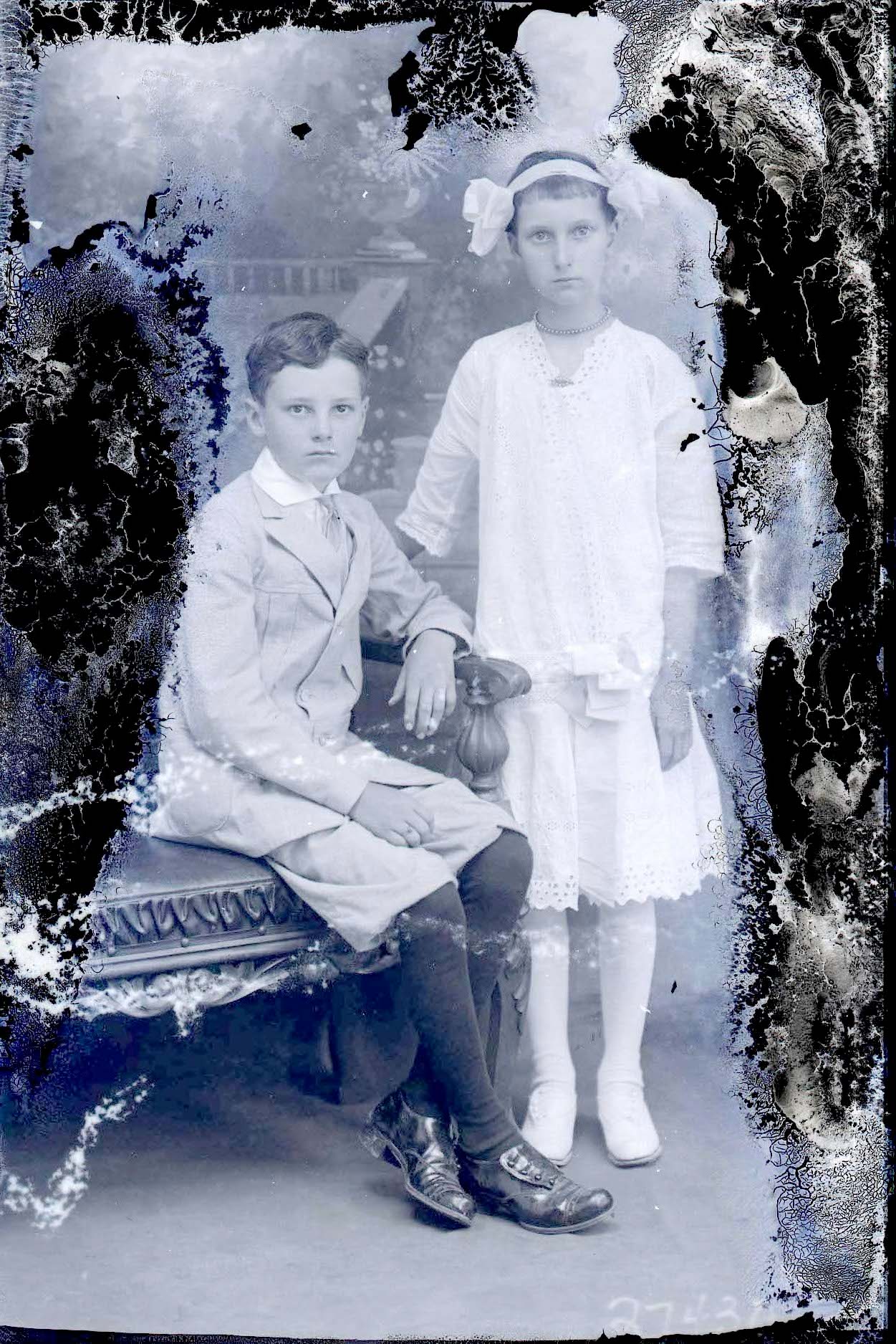 Unidentified boy is seated, with an older girl, wearing bows in her hair and a bead necklace, stands beside him.