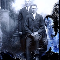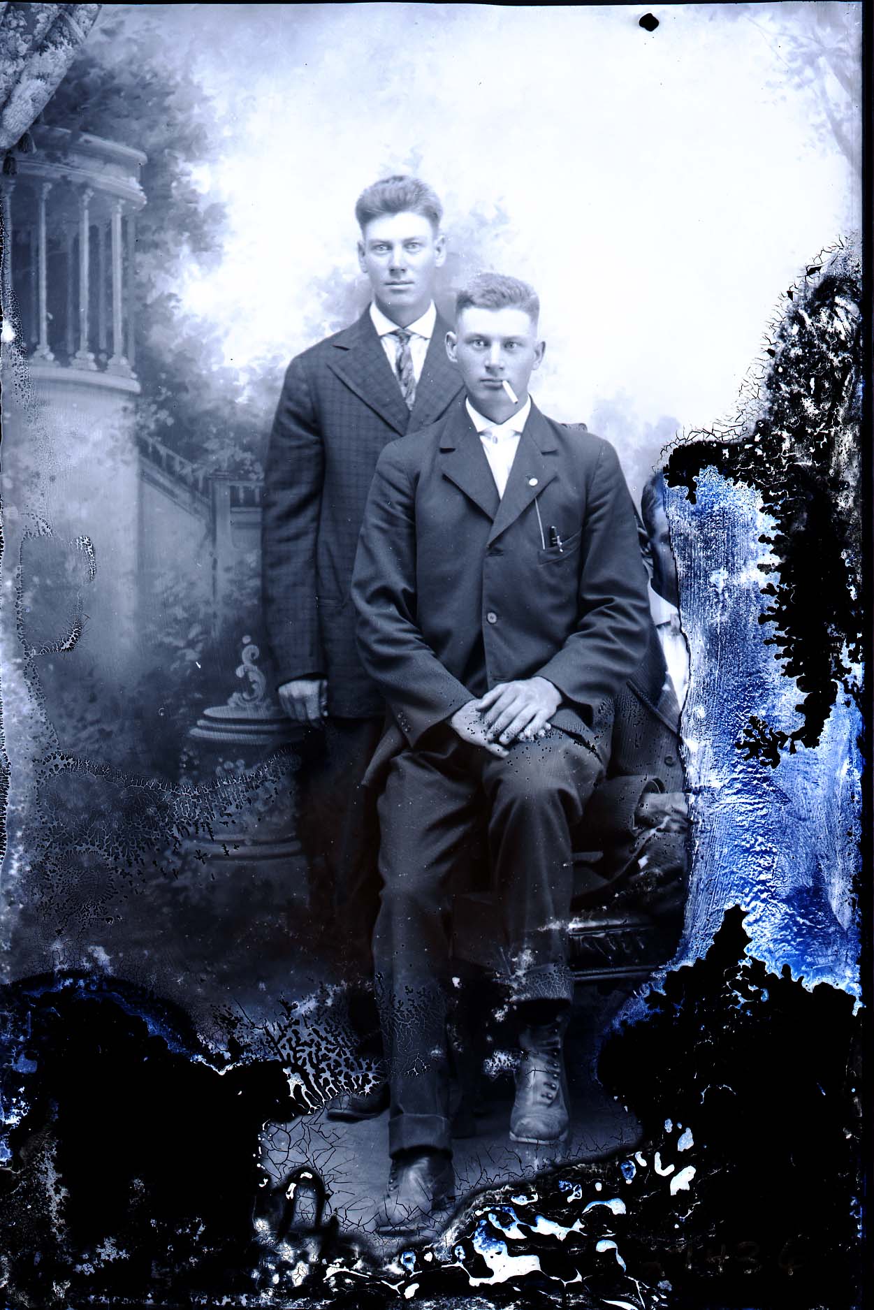 There is a third man seated on the bench, however, emulsion damage to the glass plate has obscured him almost completely.