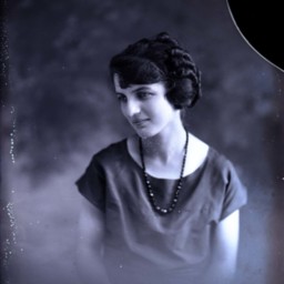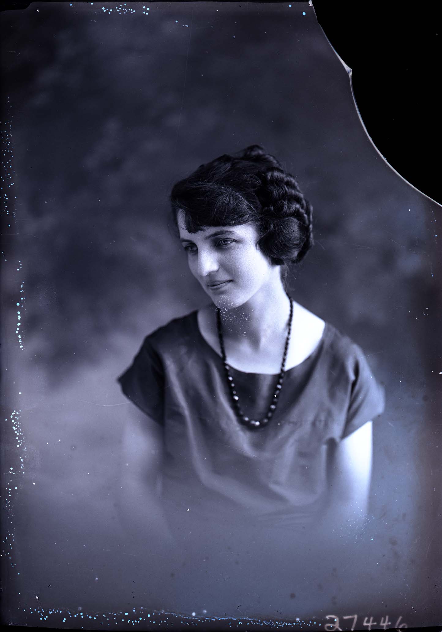 Portrait photograph of an unidentified woman wearing a bead necklace and looking downwards and to the side of the camera.