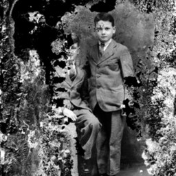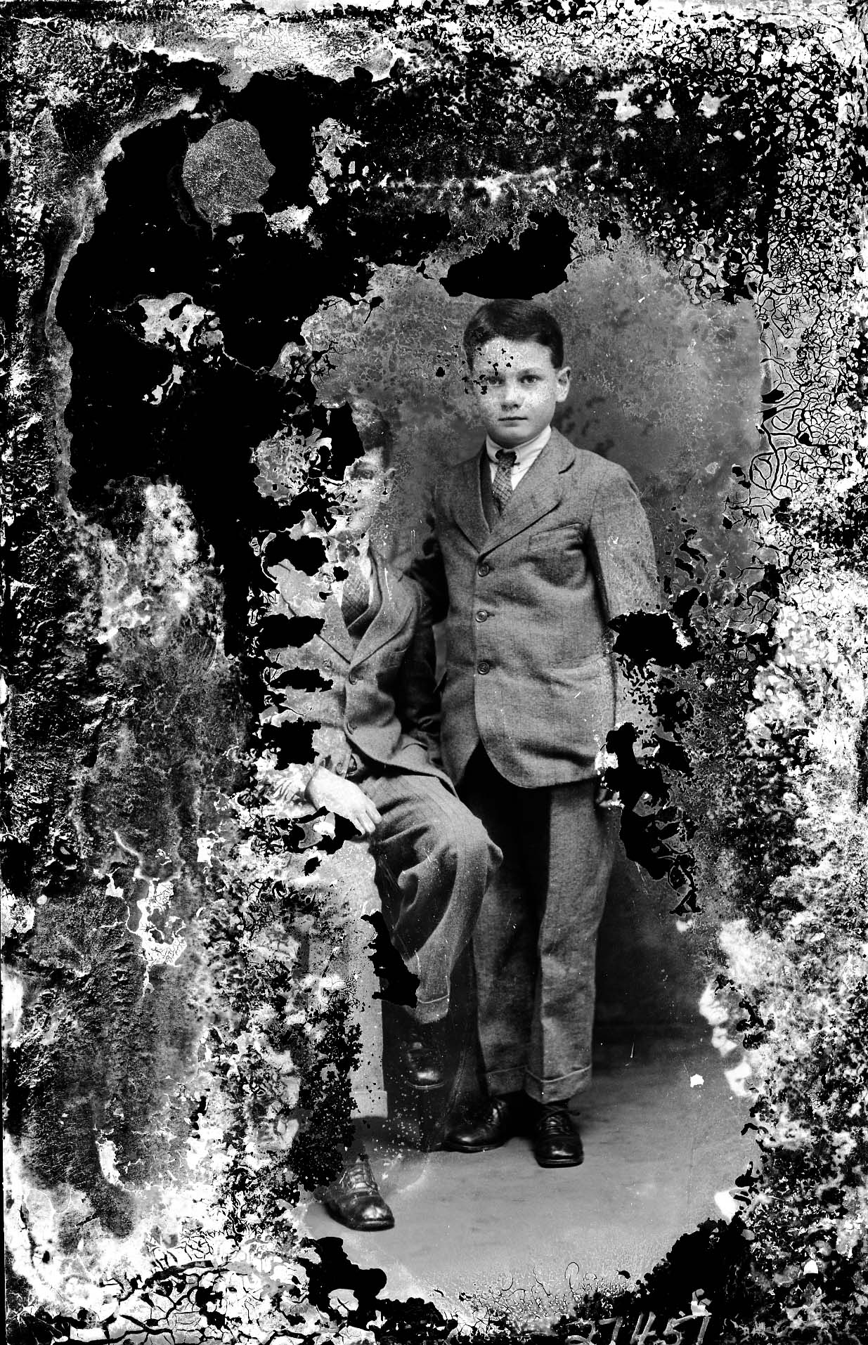 Significant emulsion damage to the glass plate has obscured much of the boy on the left.