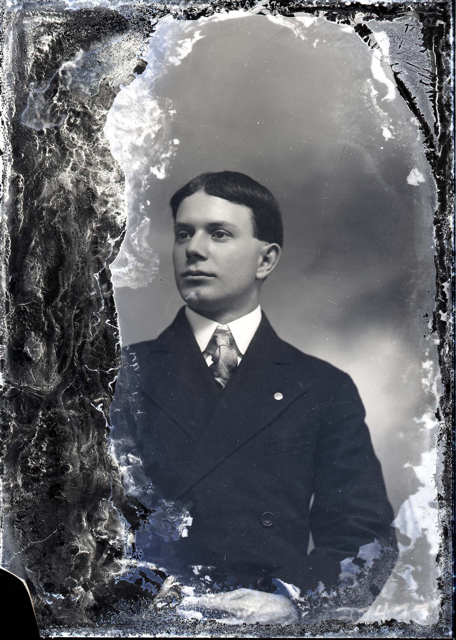 Portrait photograph of an unidentified young man wearing a double breasted suit and tie with a starched collar and a pin on his lapel.