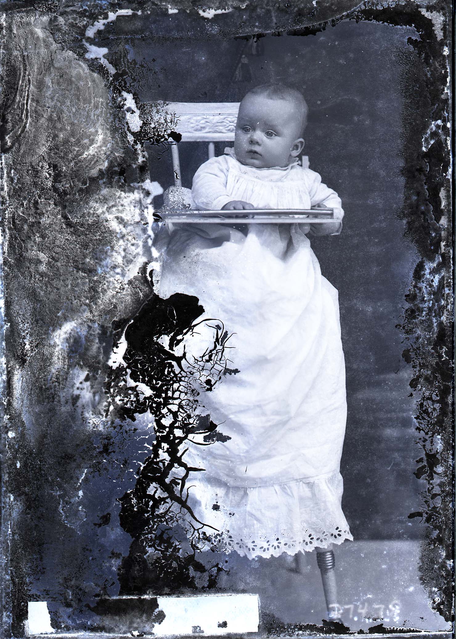 Unidentified baby in a long white gown is seated on a child's high chair.