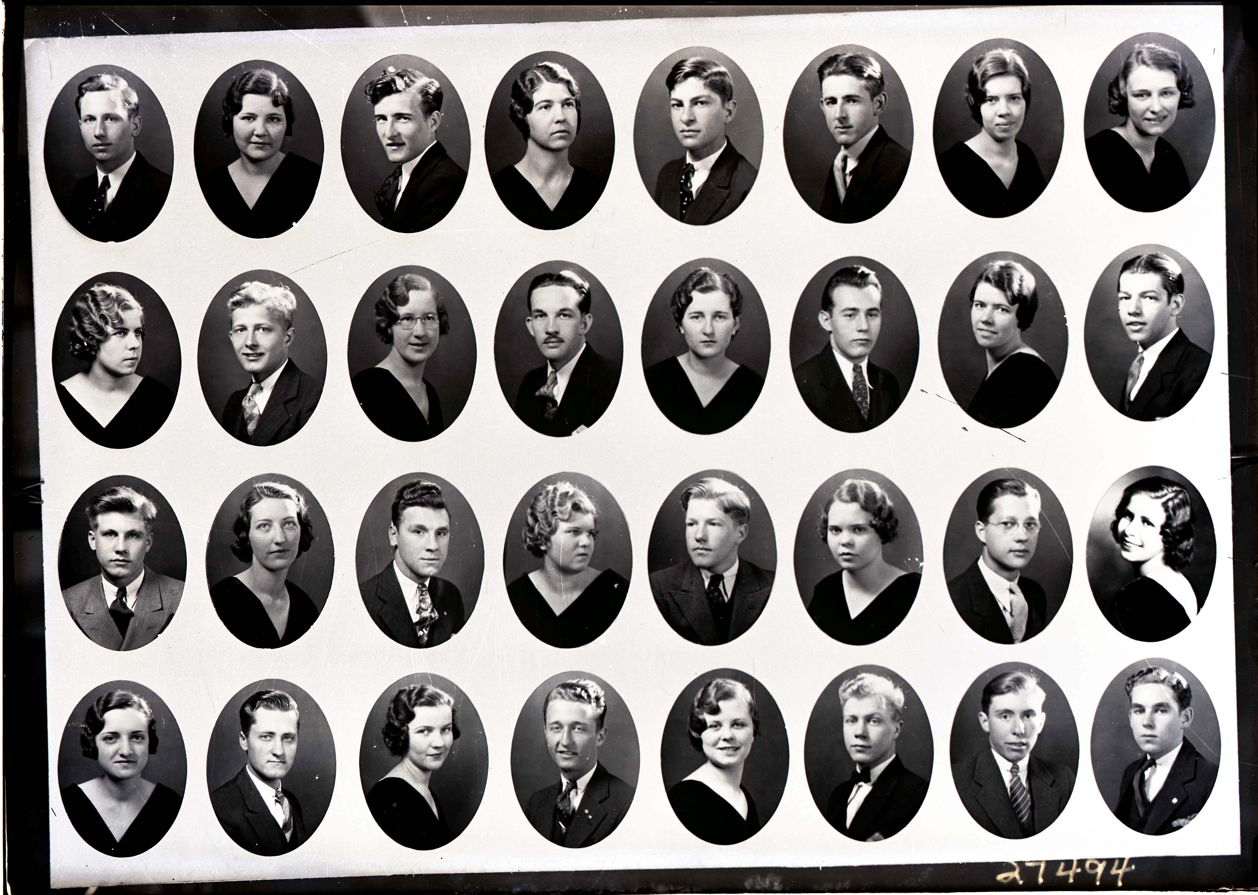 Photo of a photograph showing 32 individual portrait photographs of various unidentified young men and women, probably students, compiled as one larger image.