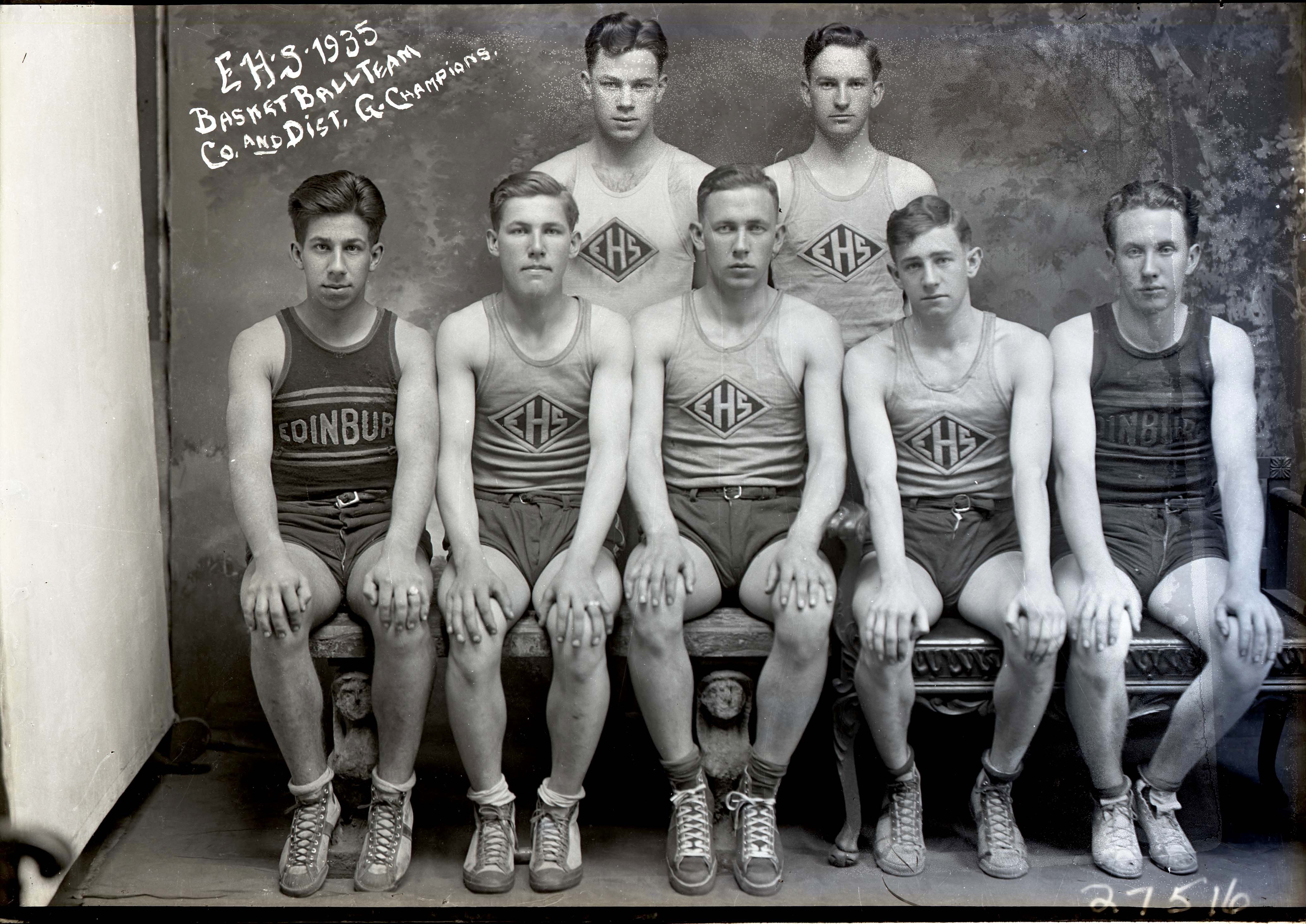 Members of the Edinburg High School's basketball team from 1935 wearing their school's uniform.