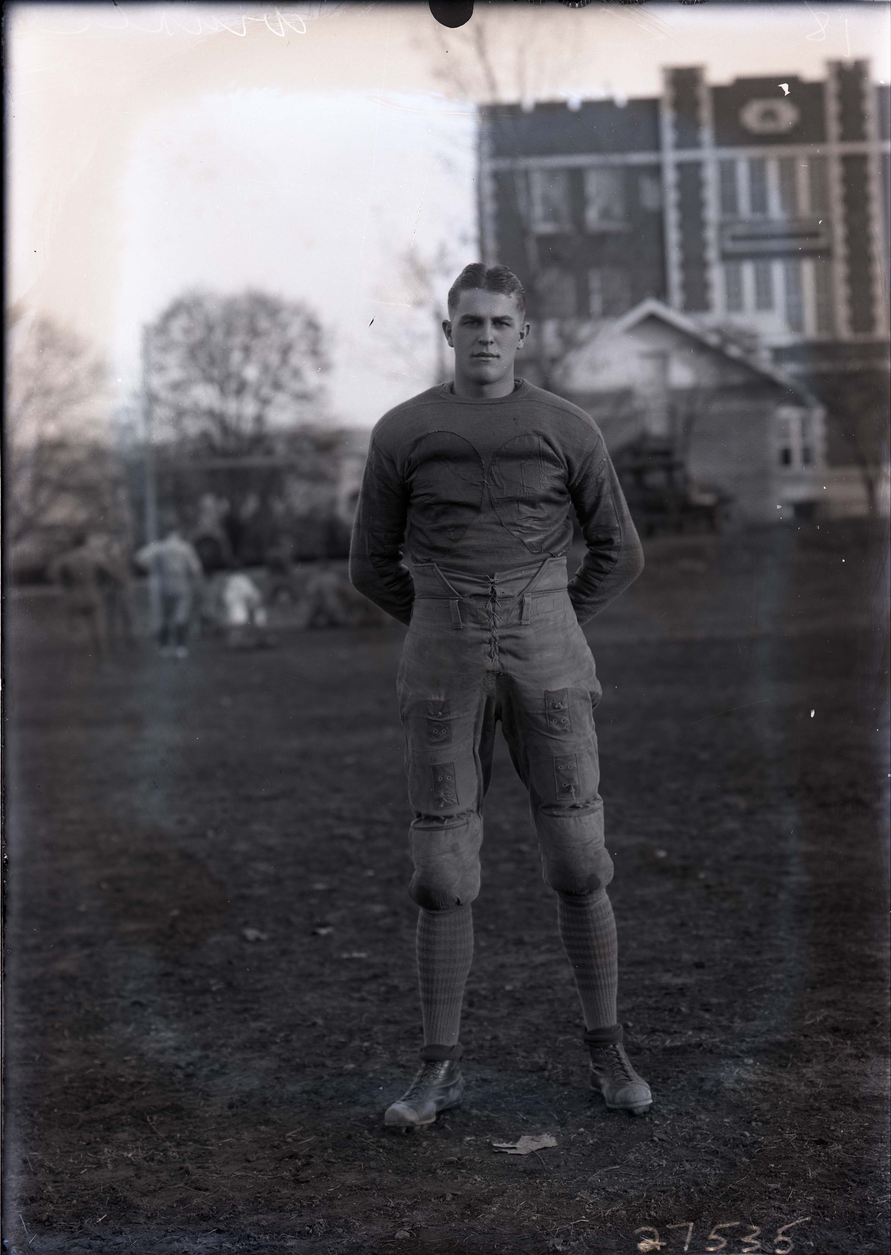 Winkel was a cadet at Massanutten Military Academy (MMA) and is wearing his school's football team uniform. He is standing in a field with campus buildings behind him.