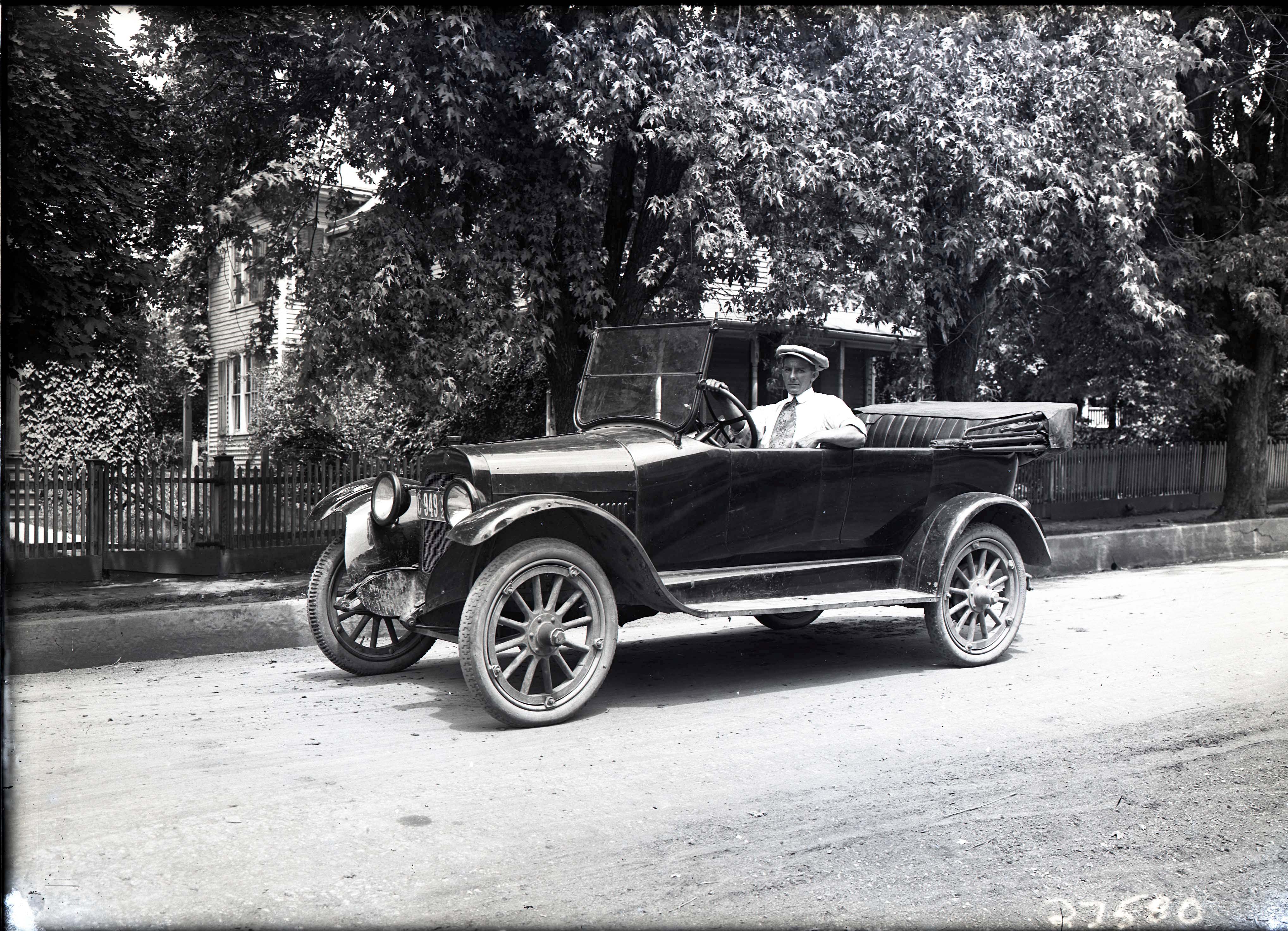 Unidentified man in a cap is sitting in an automobile with the top down and windscreen up.