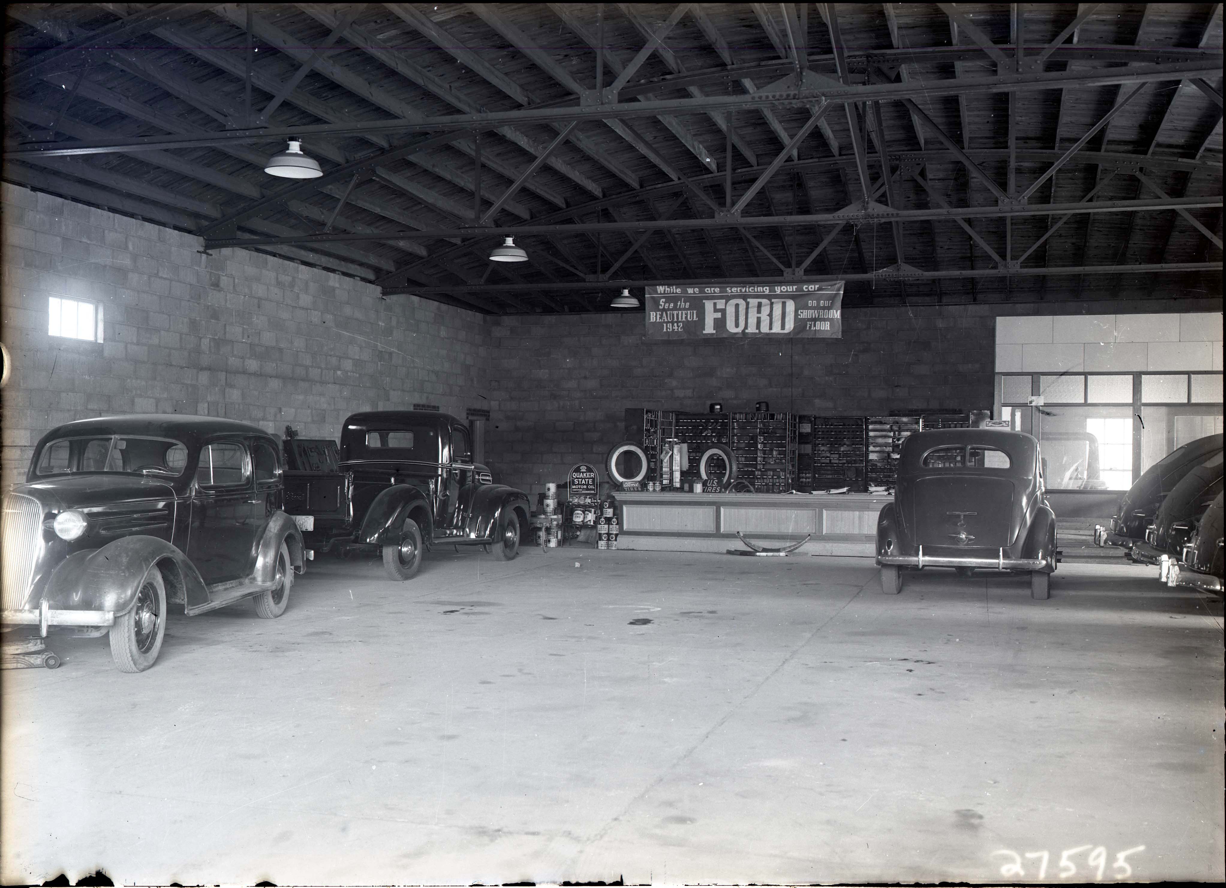 Several cars from the 1930's and 1940's are visible. A sign says, "While we are servicing your car, see the beautiful 1942 Ford on our showroom floor".