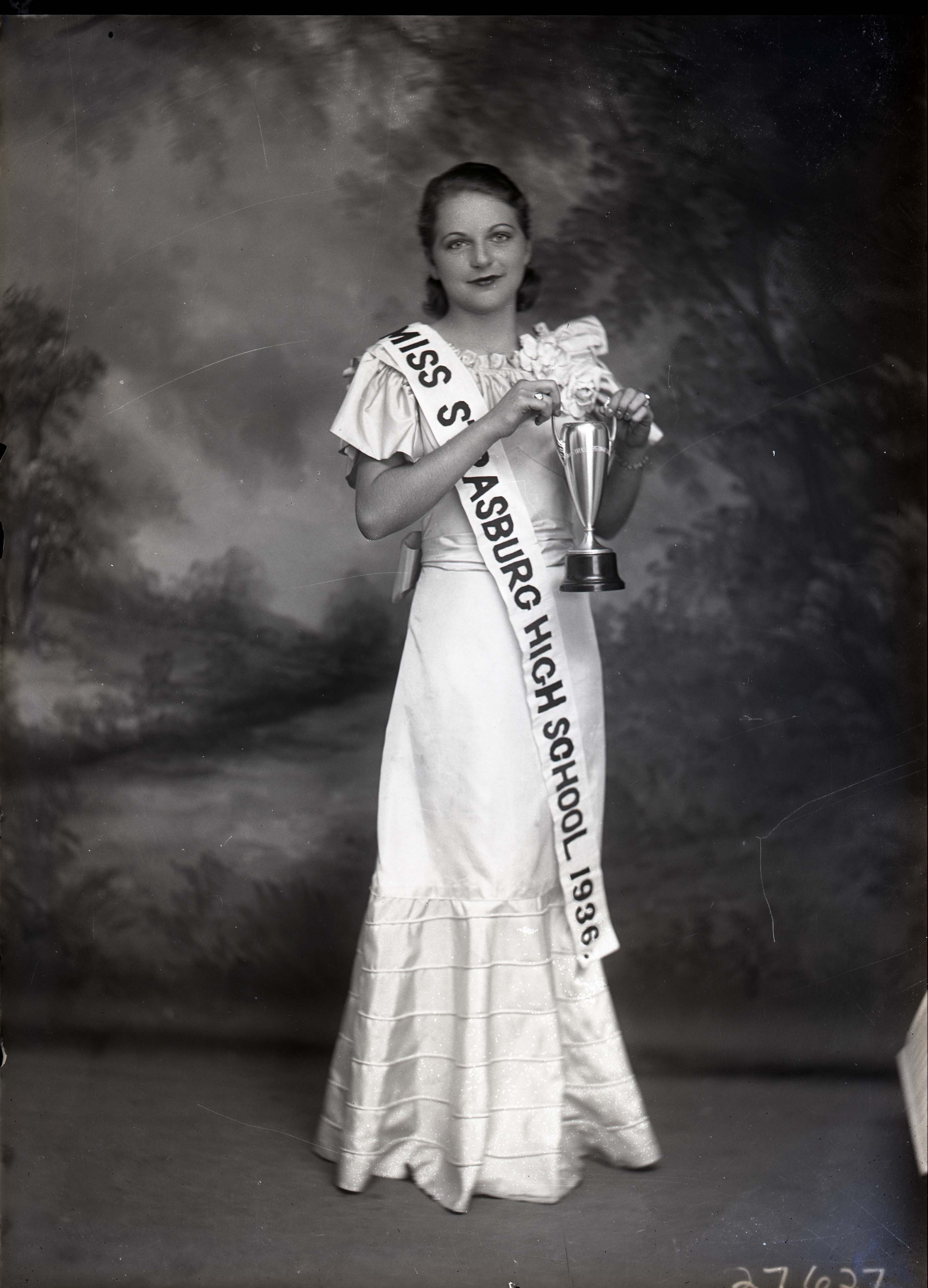 Unidentified young woman in a long dress is wearing a sash that says, "Miss Strasburg High School 1936". She is holding a trophy as well.