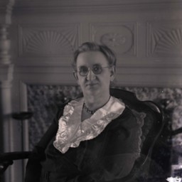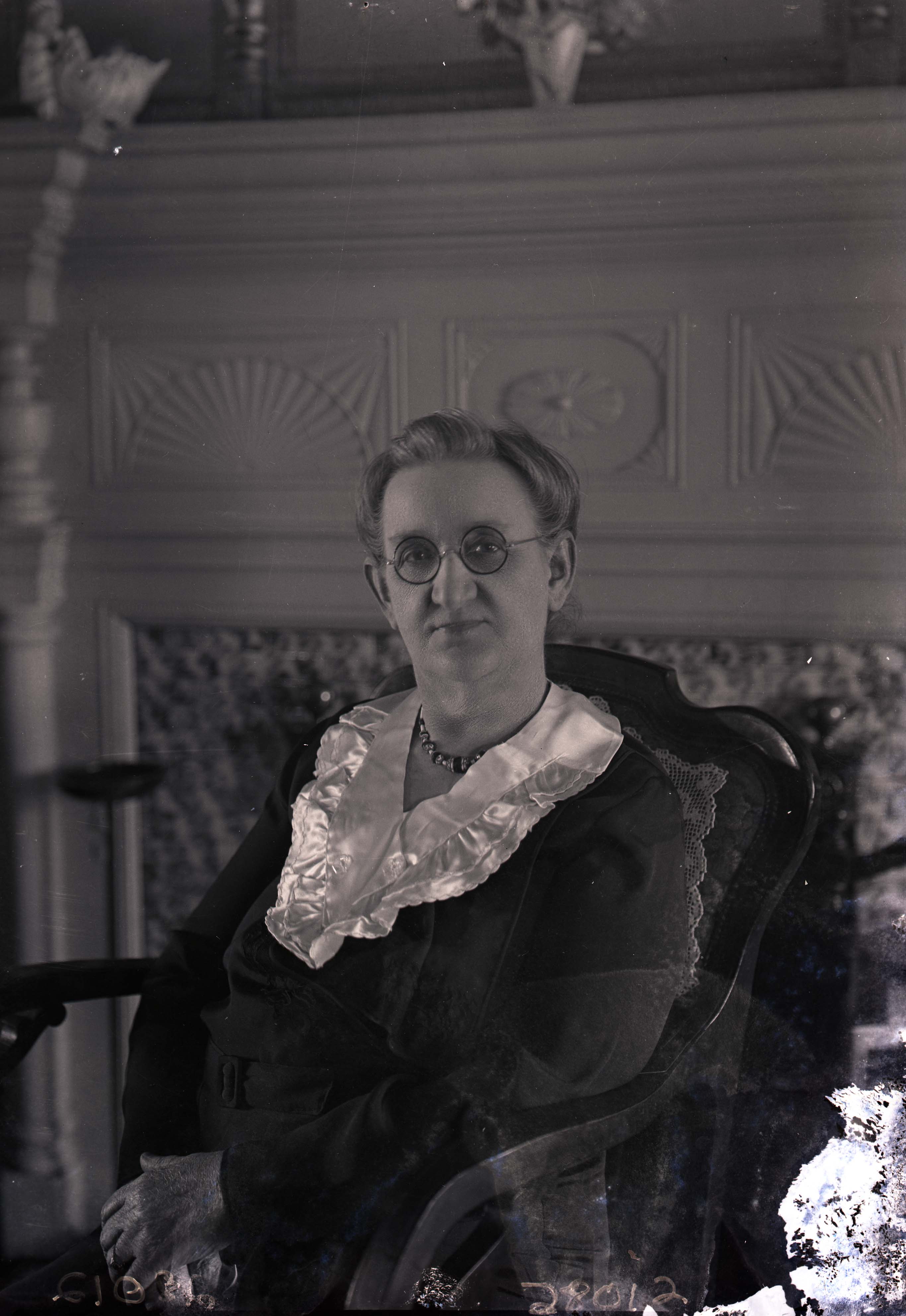 Portrait photograph of an unidentified woman with round glasses and her hair styled up. She is posed seated on a chair in front of a fireplace.