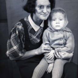 Unidentified woman with short hair and wearing a plaid blouse is seated with an unidentified child on her lap.