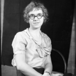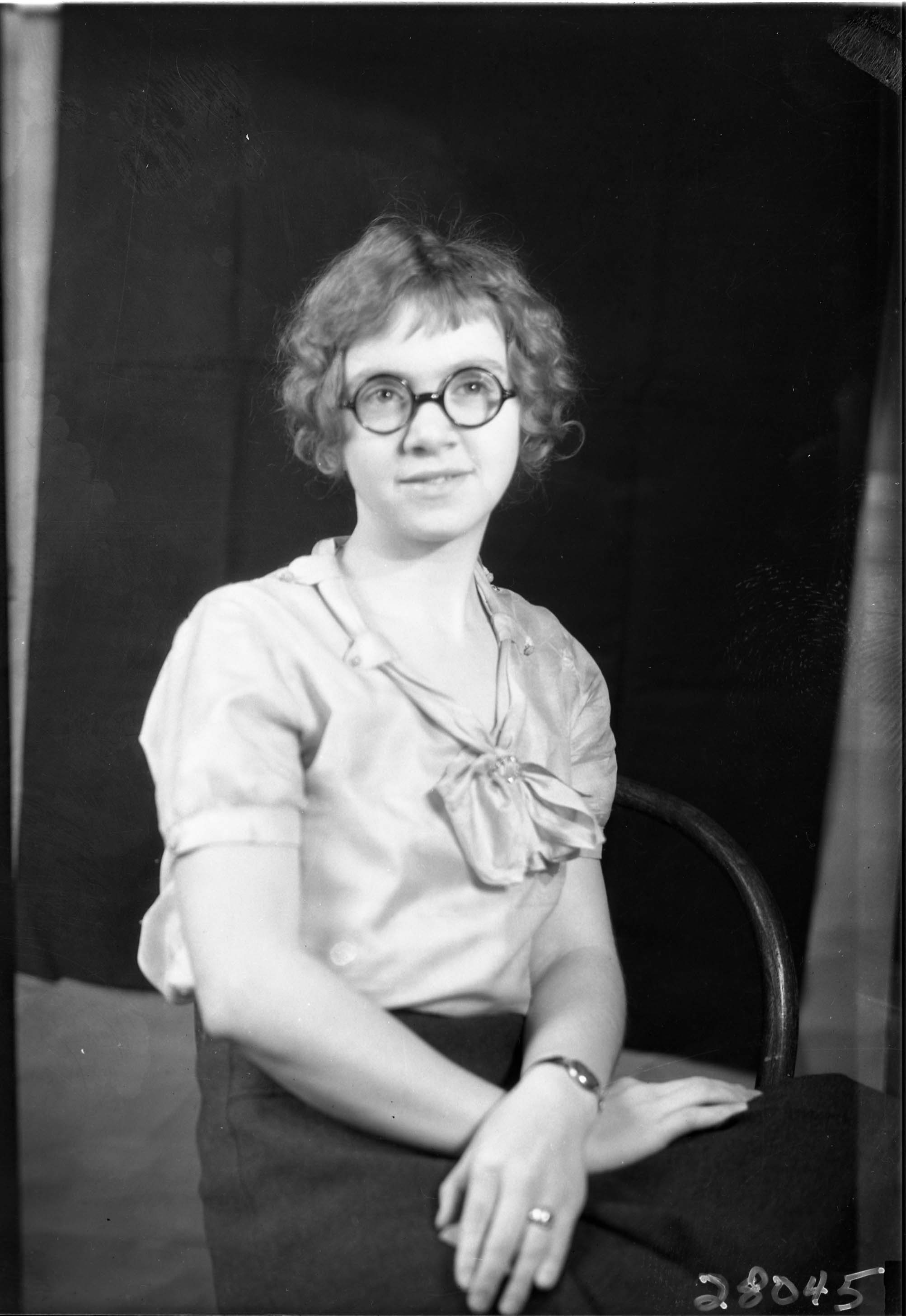 Unidentified woman with short hair and round glasses, is seated with her hands in her lap.