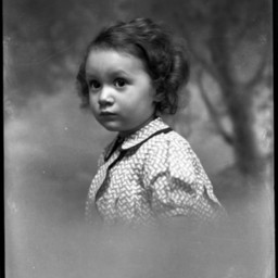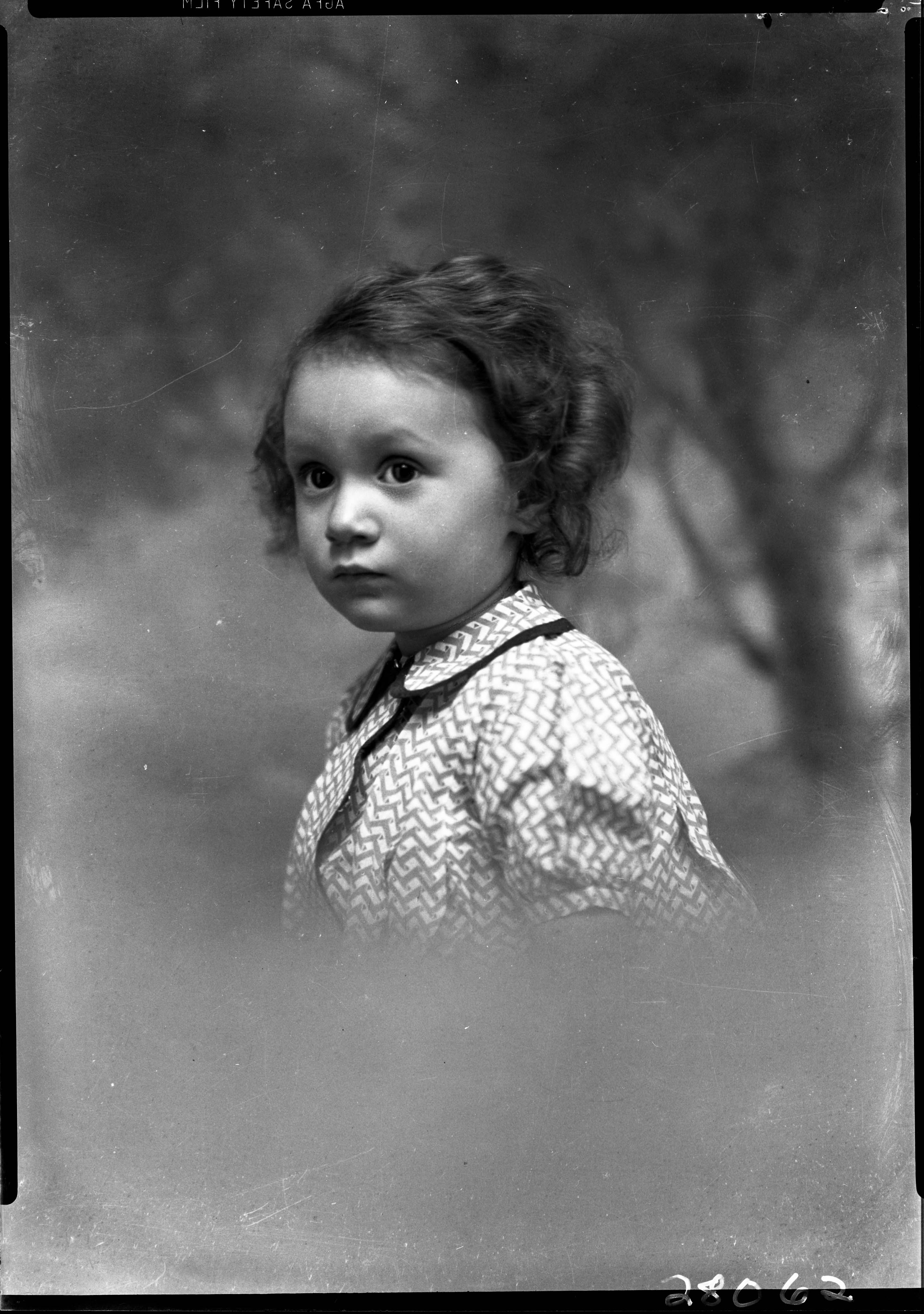 Portrait photograph of an unidentified girl with short hair and wearing a print dress.