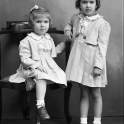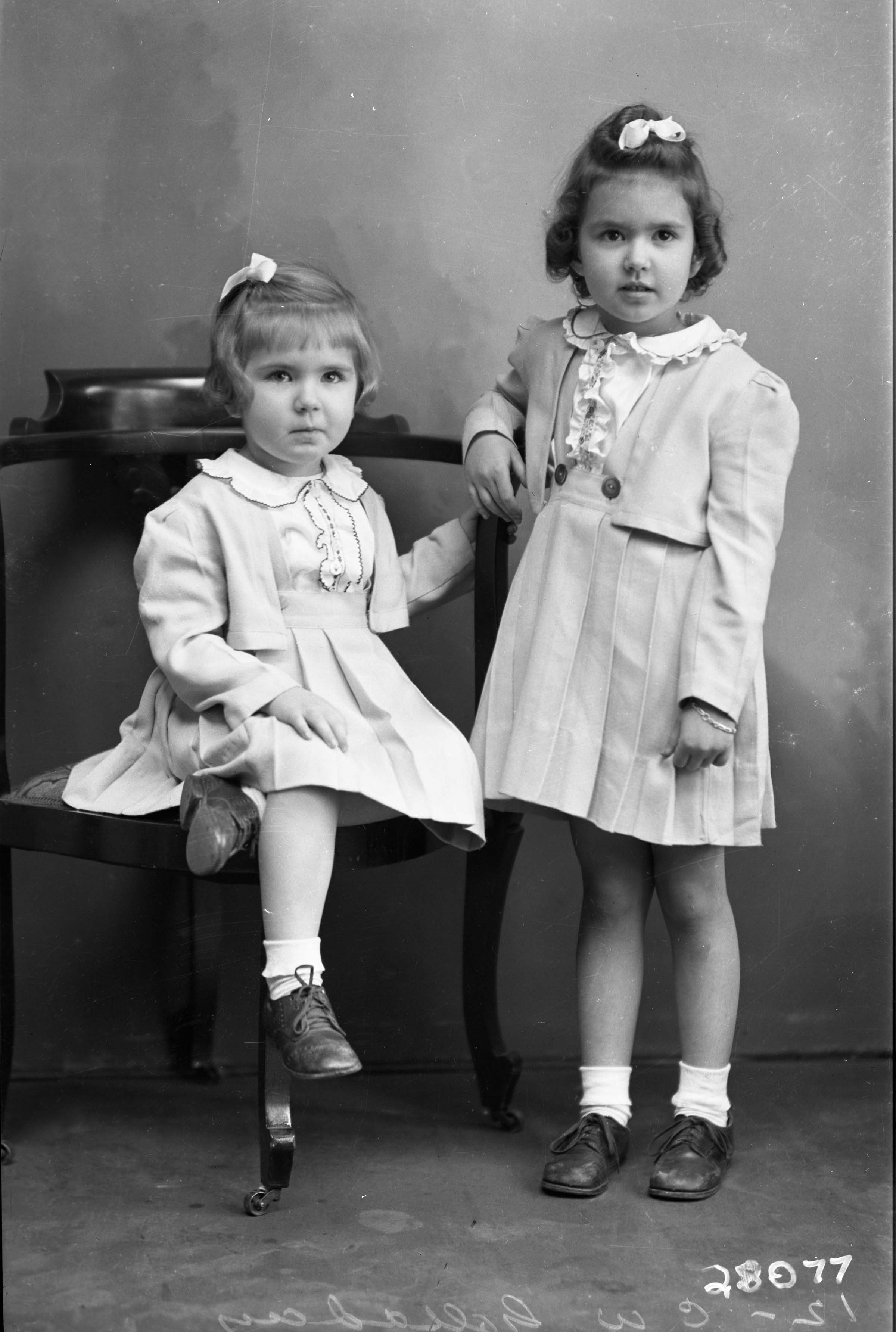 Two unidentified young girls, one seated and an older one standing beside her, are posed together with a chair.