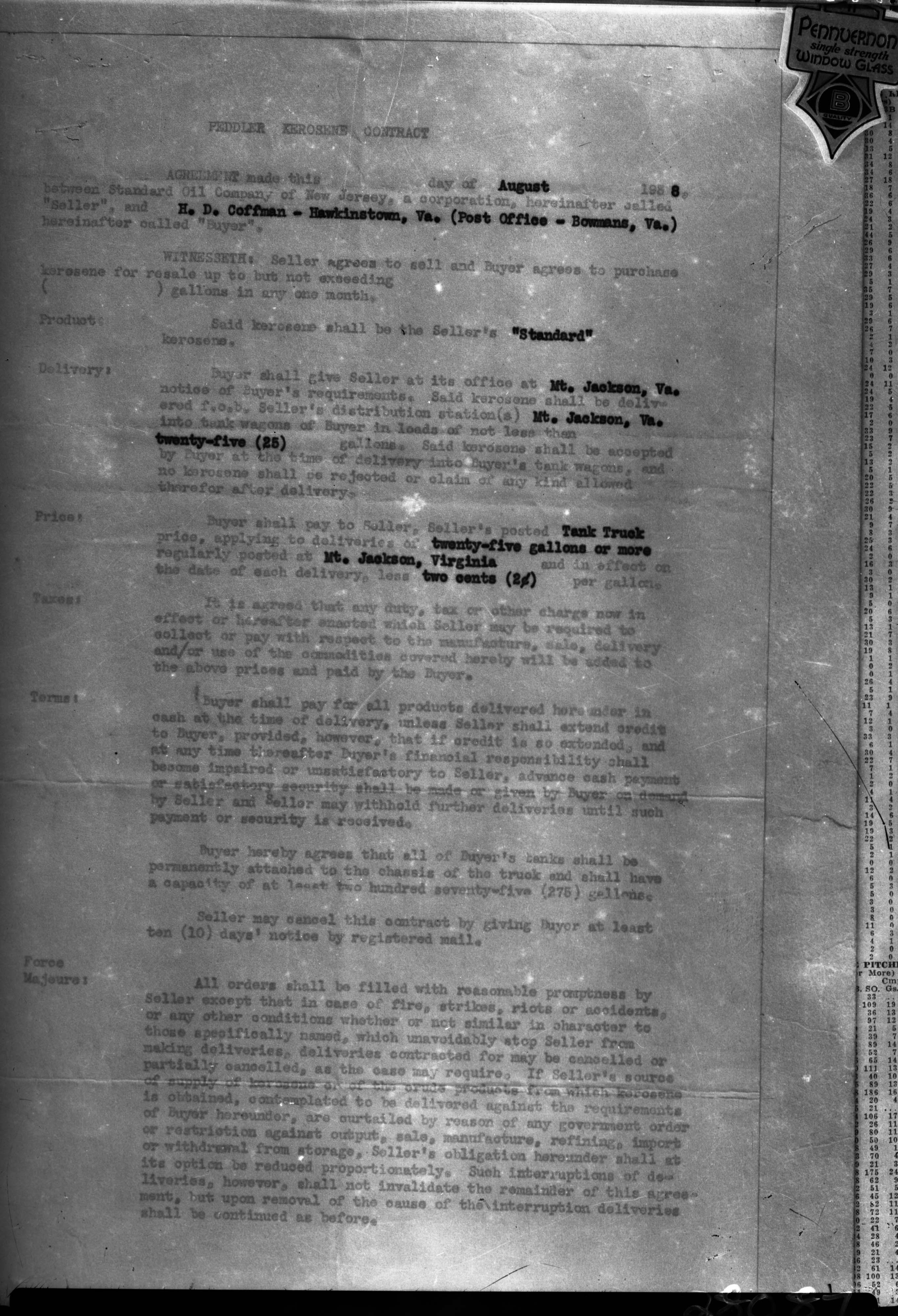 Photograph of a typed page of a contract dated August 1938 between the Standard Oil Company of New Jersey (with an office in Mt. Jackson) and H.D. Coffman of Hawkinstown, Virginia.