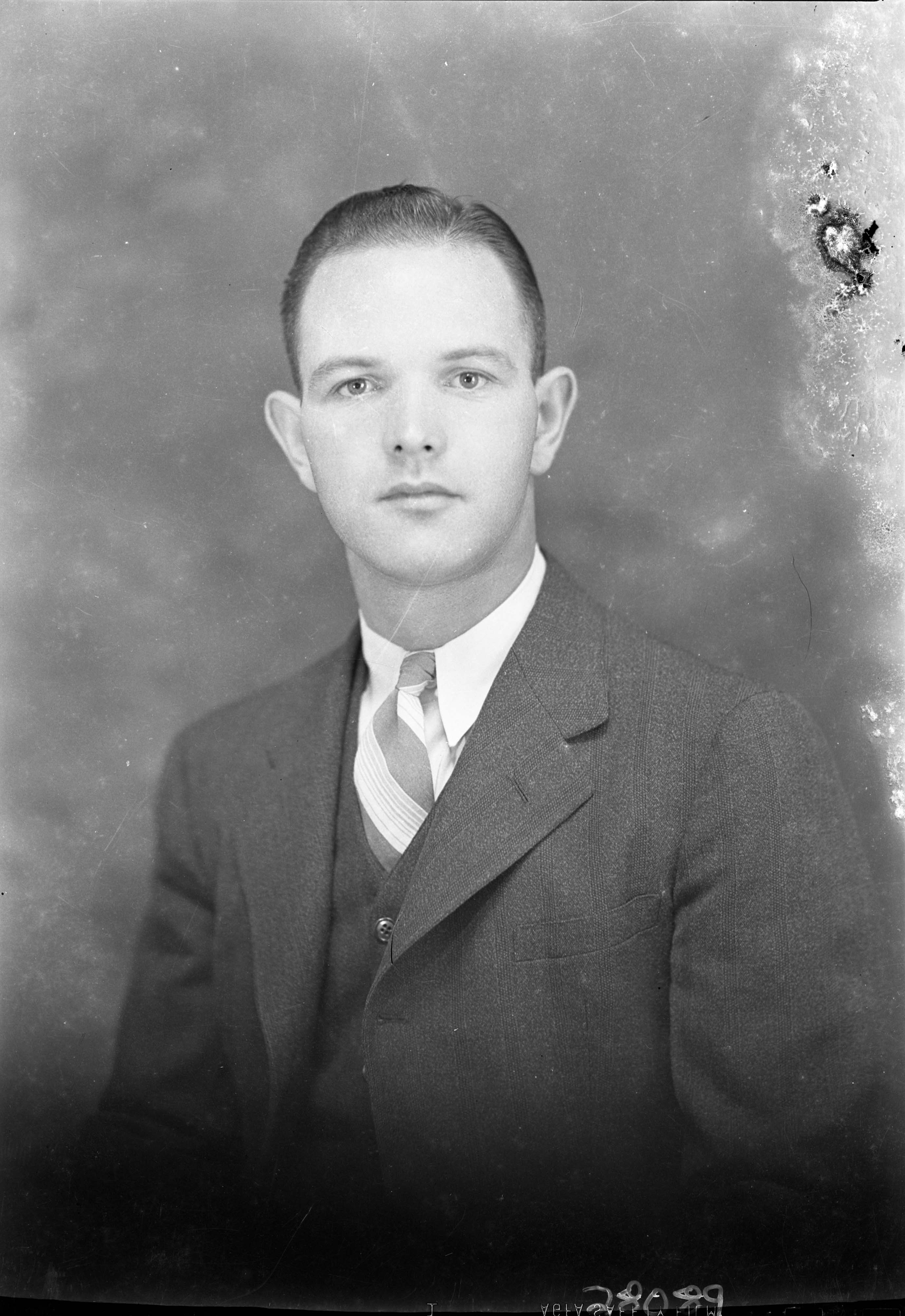 Portrait photograph of Jay Hunter Stickley as a young man in a suit and striped tie.