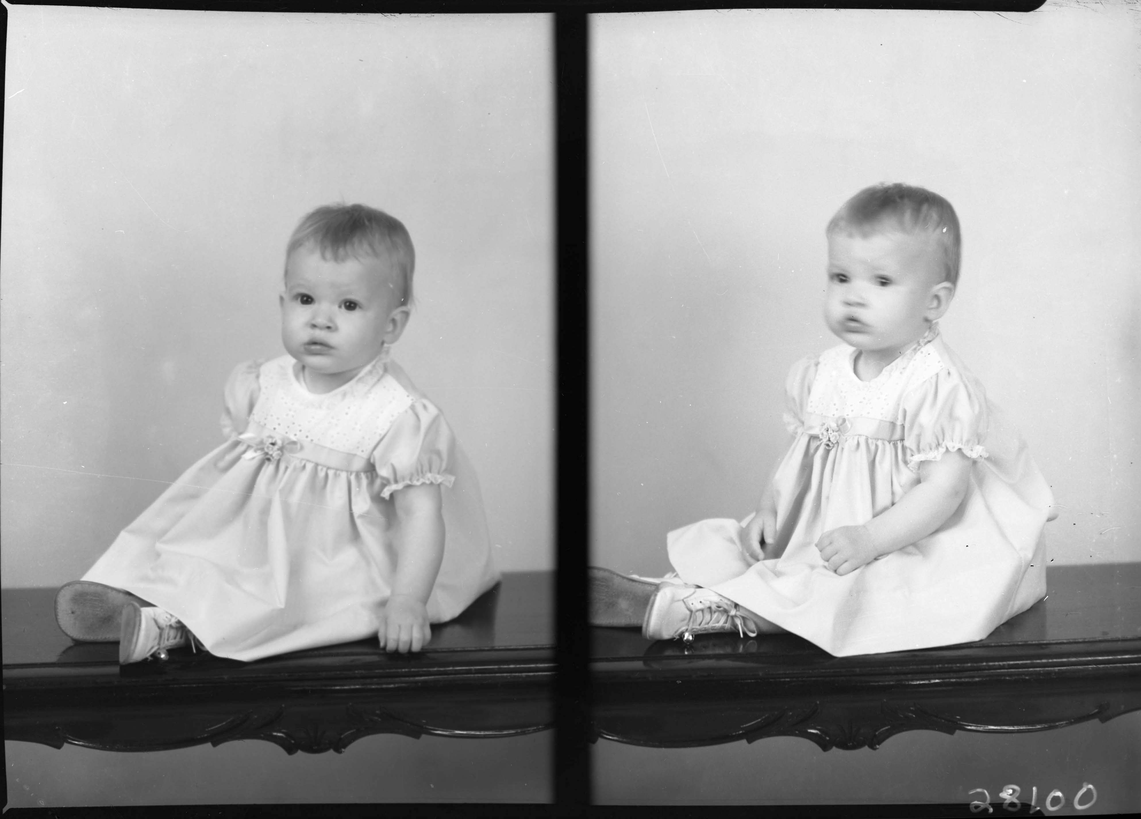 Photo of two separate images of an unidentified baby seated on a bench.