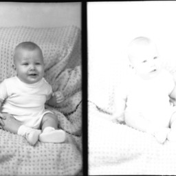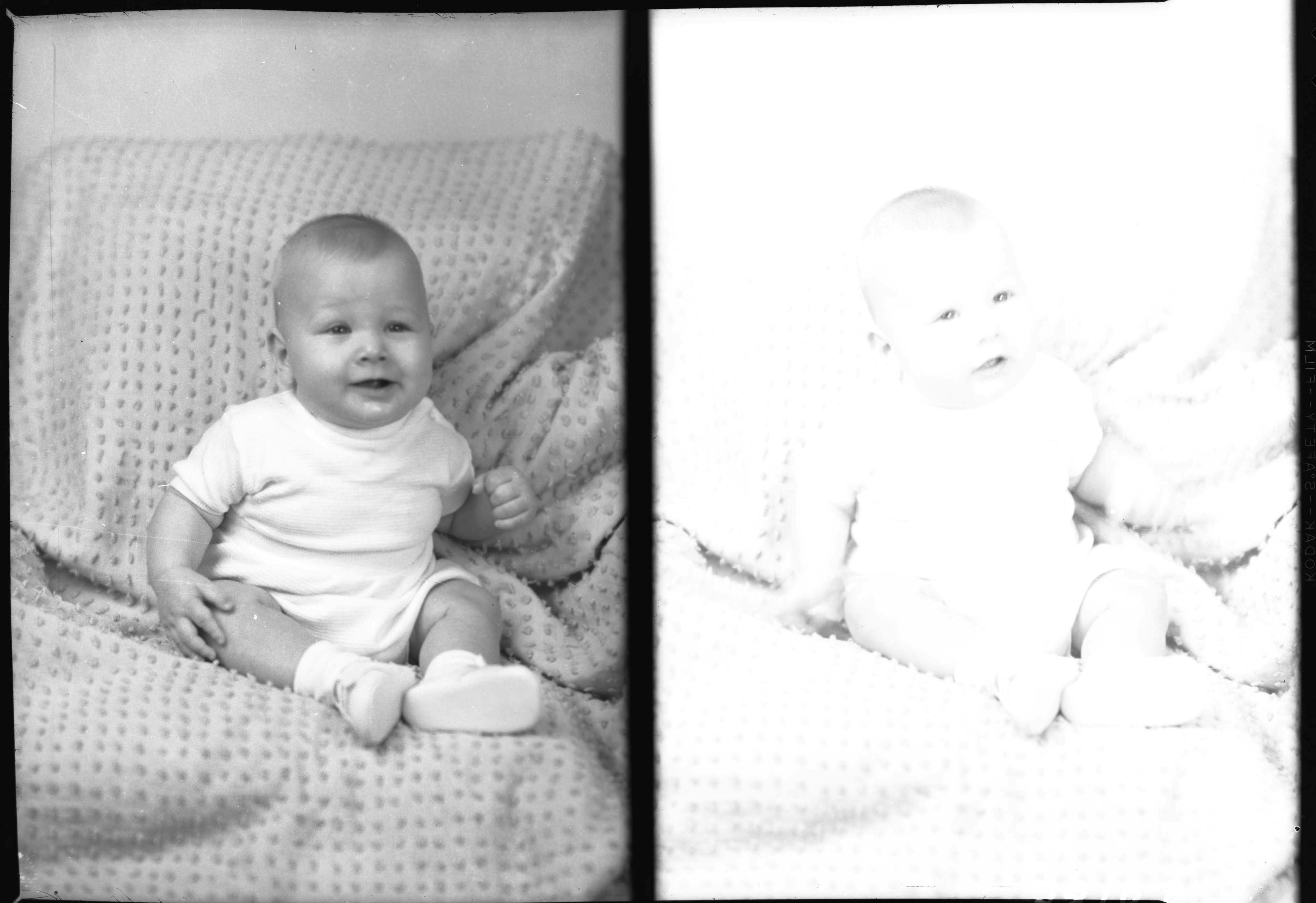 Photo of two separate photographs of the same unidentified baby. The image on the right is overexposed.