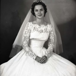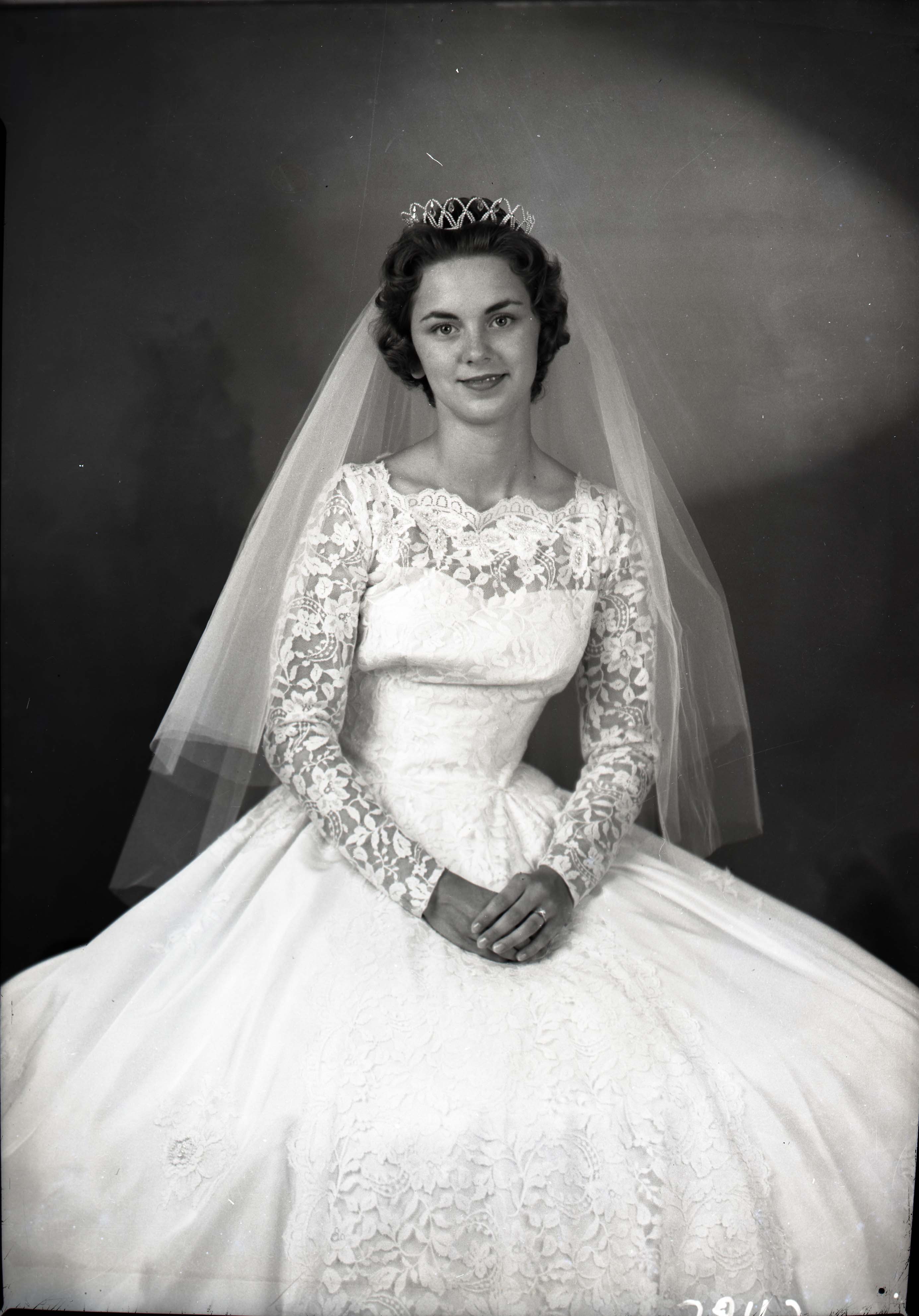 Unidentified young bride with short hair, is wearing a wedding gown and veil. She is seated with her hands in her lap.