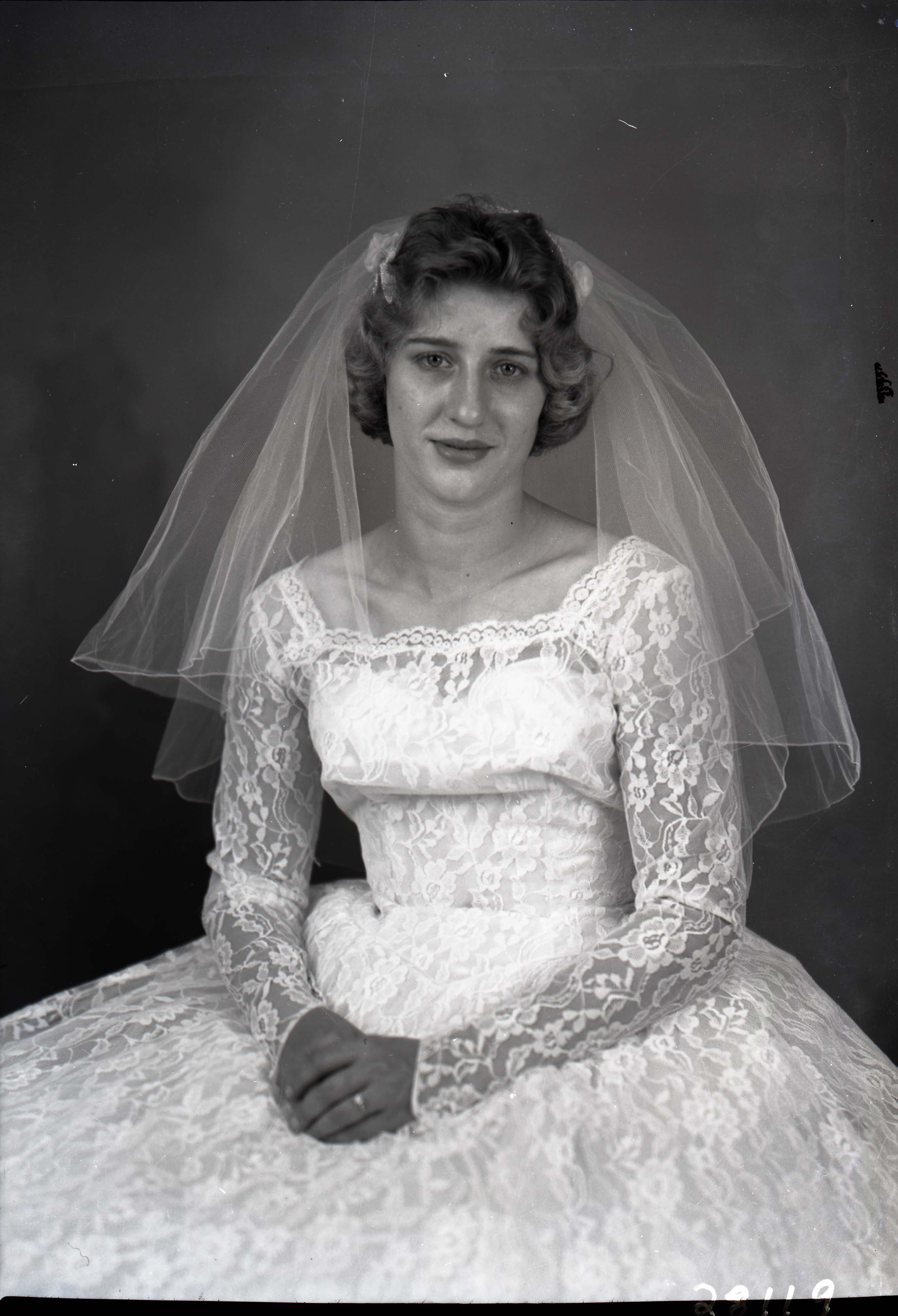 Photograph of Wanda (Dodson) Morefield as a bride and seated wearing a bridal veil and gown.