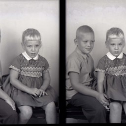 Photo of a two separate photographs of the same two unidentified children, a boy and a girl, posed together on a bench.