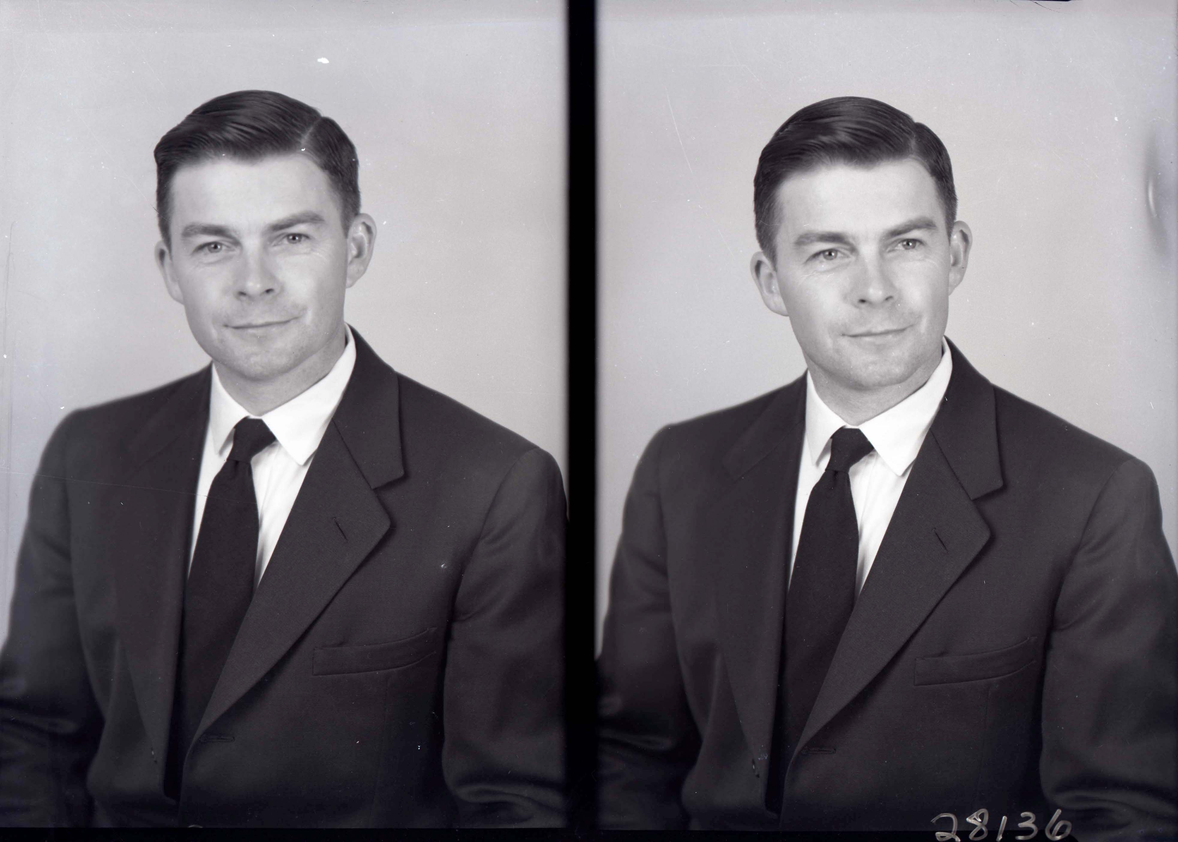 Photo of two separate portrait photographs of Elvin Carl Walker wearing a suit and tie.