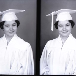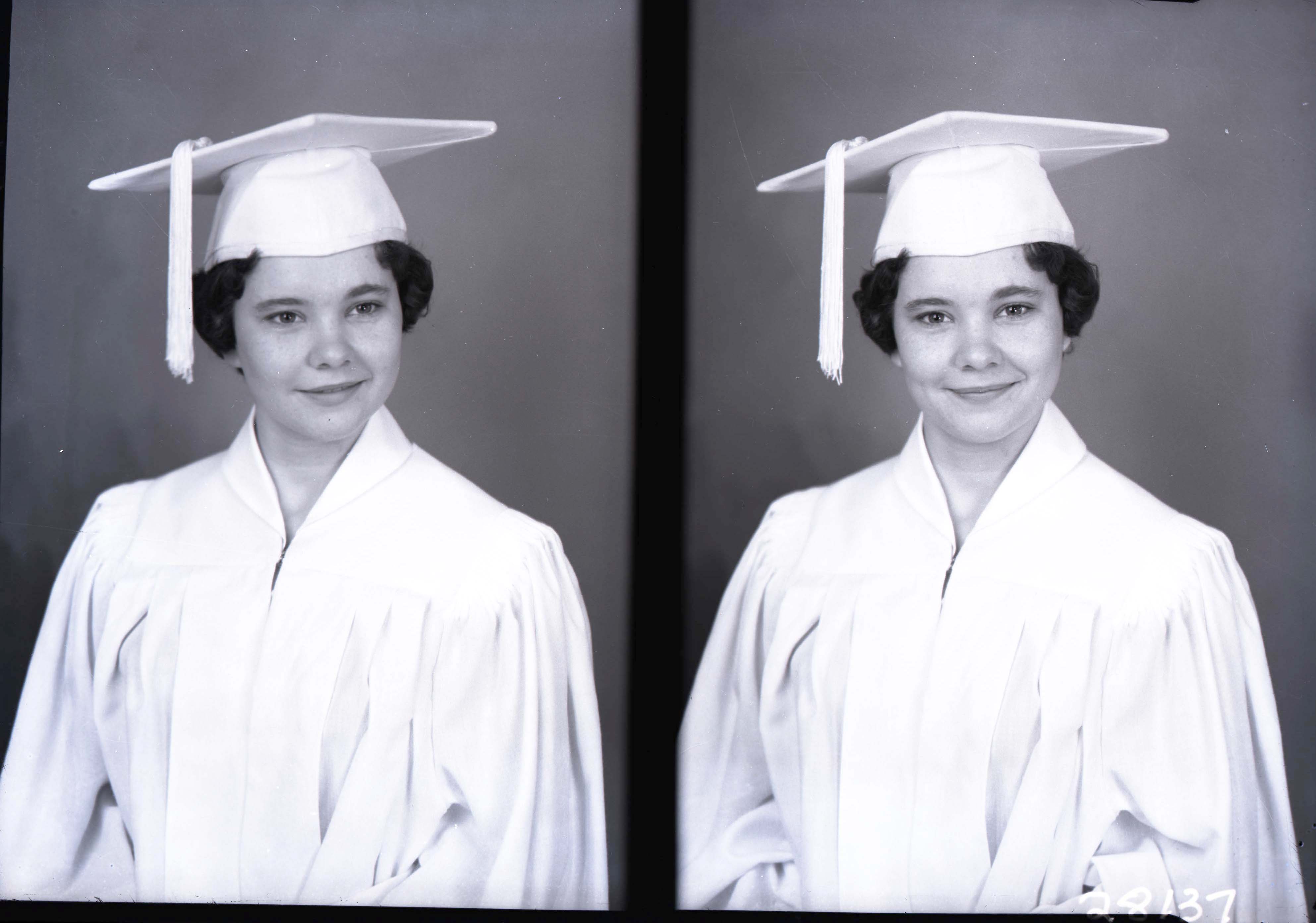 Photo of two separate portrait photographs of the same unidentified young woman shown in a graduation cap and gown.